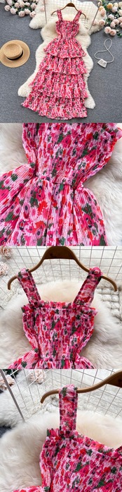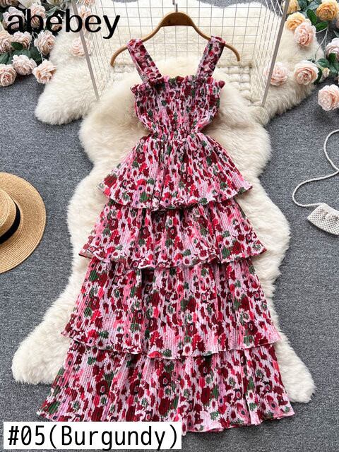 夏花柄ケーキロングドレスシャーリングスリムプリーツサンドレスストリート背中開いたビーチドレス サマー 夏物