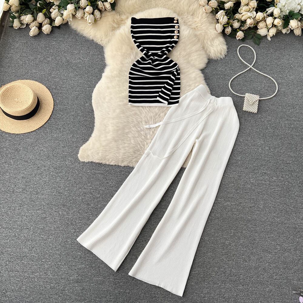 ストリップセクシーツーピースセット夏ストラップレススリムキャミソール + ワイドレッグロングパンツセットストリートツーピーススーツ サマー 夏物 ワイドパンツ