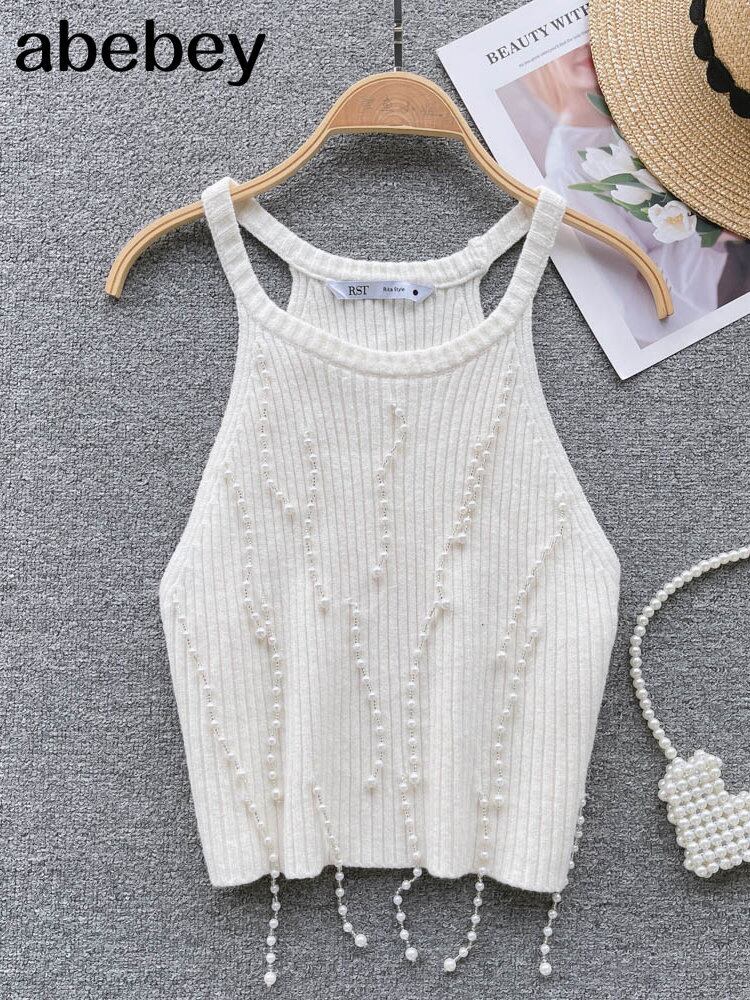 夏真珠電話クロップ トップ シームレス ショート トップス セクシー クラブ ホルター ブラウス 2 色 サマー 夏物 パール