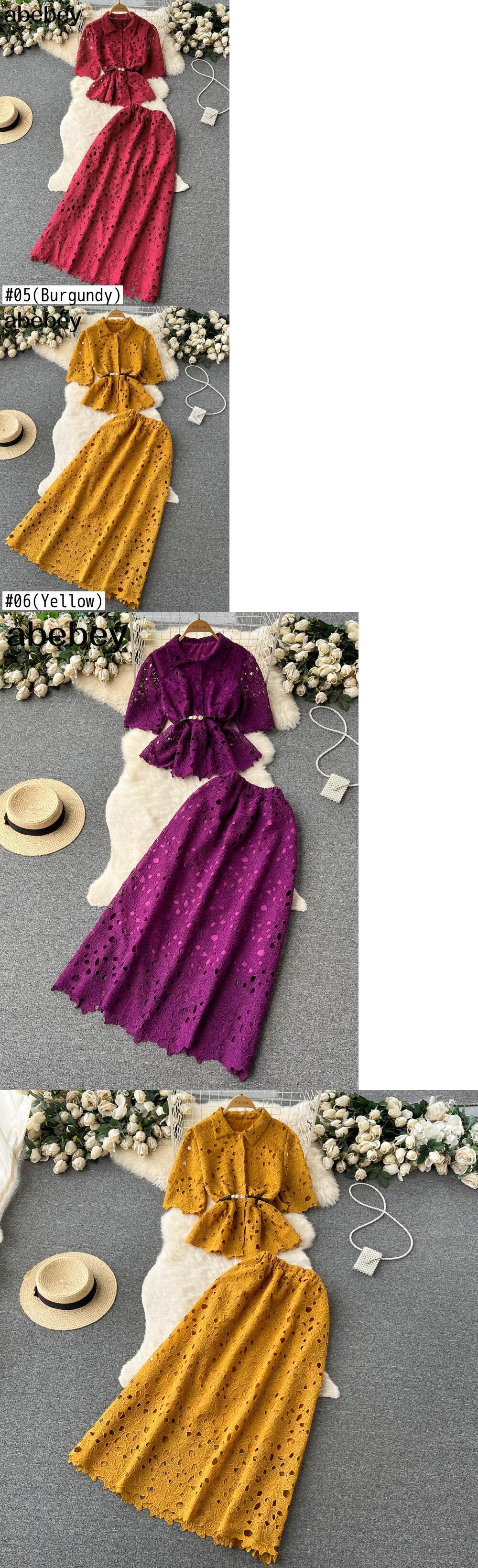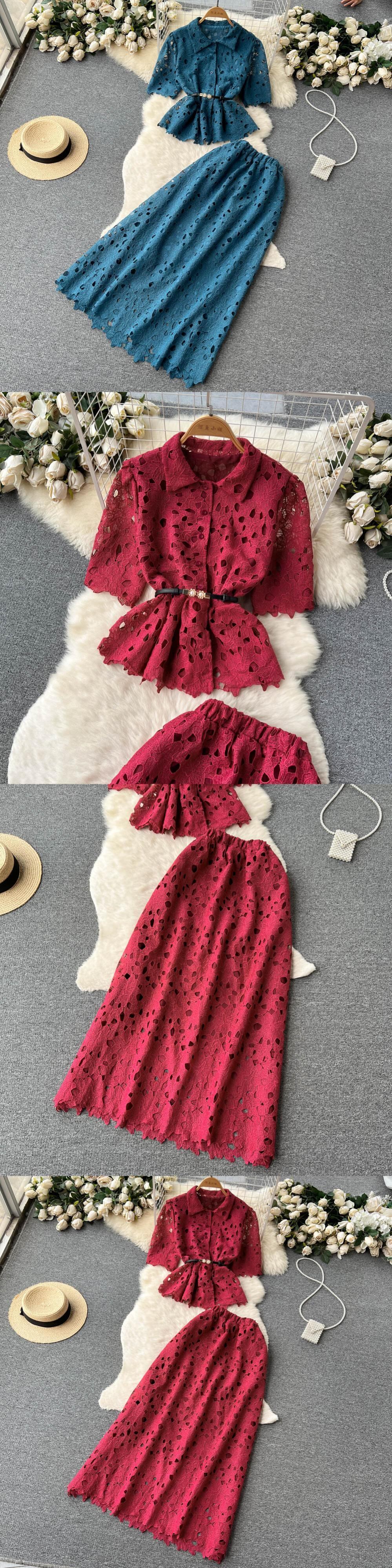 夏レースパッチワーク 2 点セット ベルト半袖トップス + ウエスト プリーツ ミディ スカート スーツ ショート ハーフスリーブ サマー 夏物 ハーネス