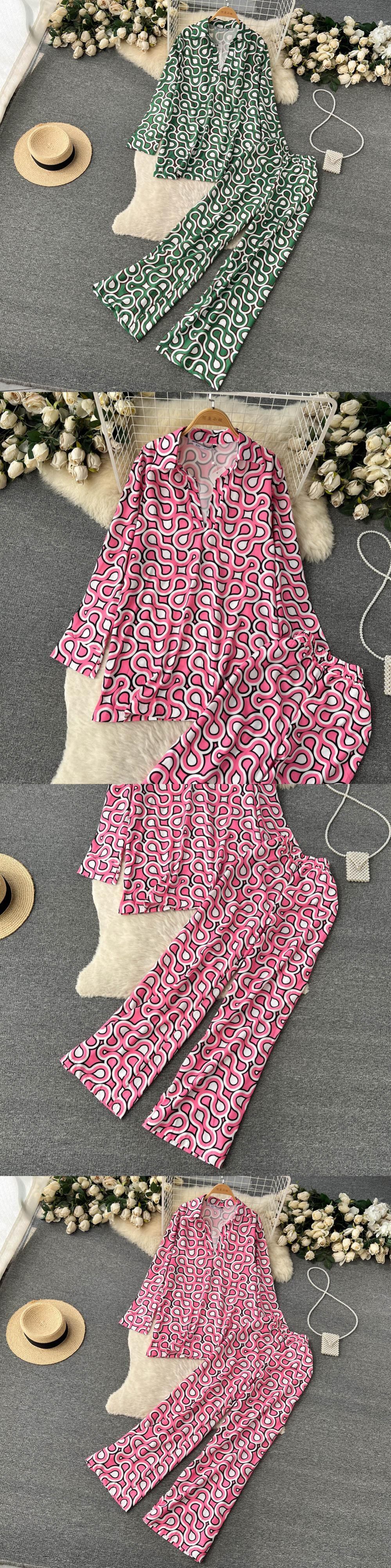 Vinage 秋スーツ緩いひだラペルブラウストップス + ワイドレッグロングパンツストリートツーピーススーツ オータム 秋物 ワイドパンツ