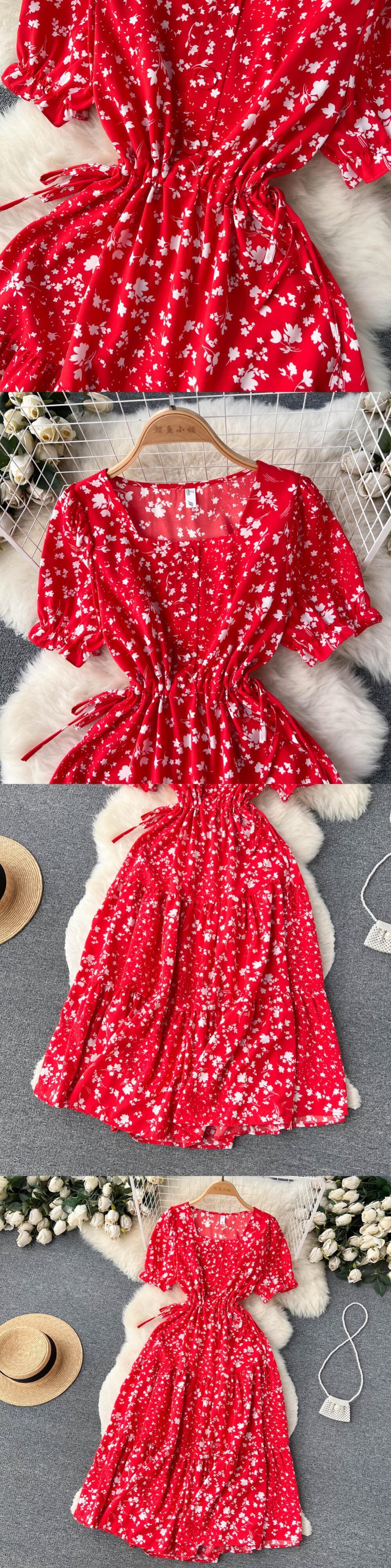 春秋スクエアカラー半袖ワンピースレースパッチワークハイウエストレースアップ花柄ミドル丈Aラインワンピース ハイウェスト ショート ハーフスリーブ スプリング 春物 オータム 秋物 スクウェア