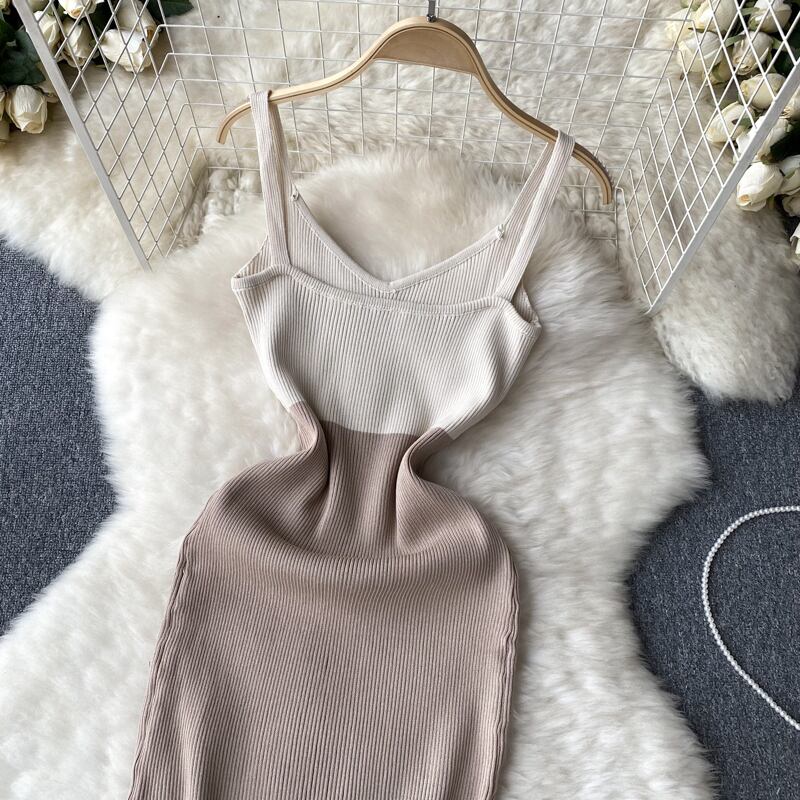 パッチワーク夏ニットセクシーストラップドレスタンクエラティックウエストボディコンサンドレスビーチ背中開いたロングドレス サマー 夏物