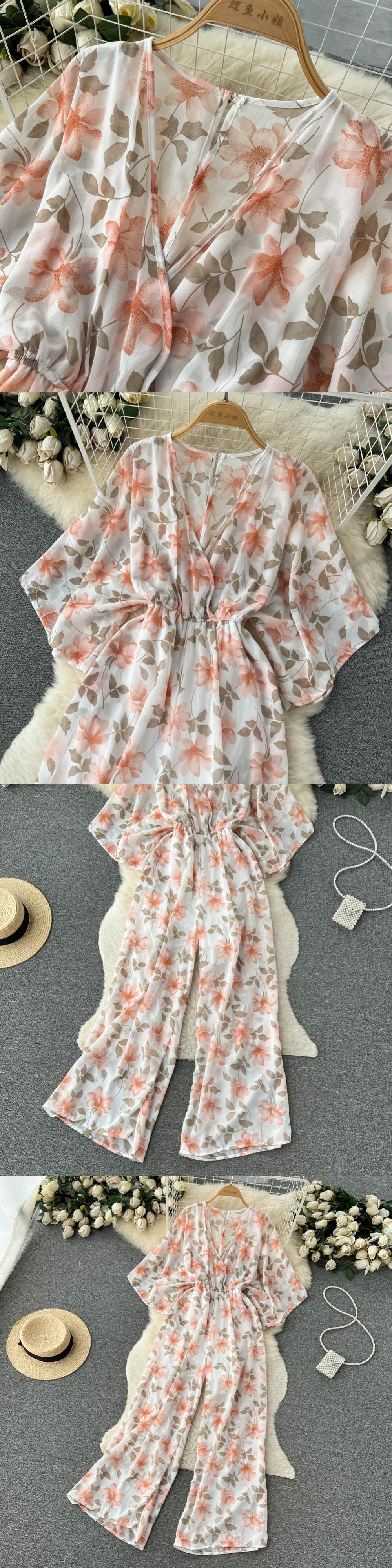 花柄ジャンプスーツ夏シックストレートパーティーオーバーオール Y2k クラブロンパース V ネックショートスリーベルパーティージャンプスーツ 半袖 ハーフスリーブ サマー 夏物 Vネック