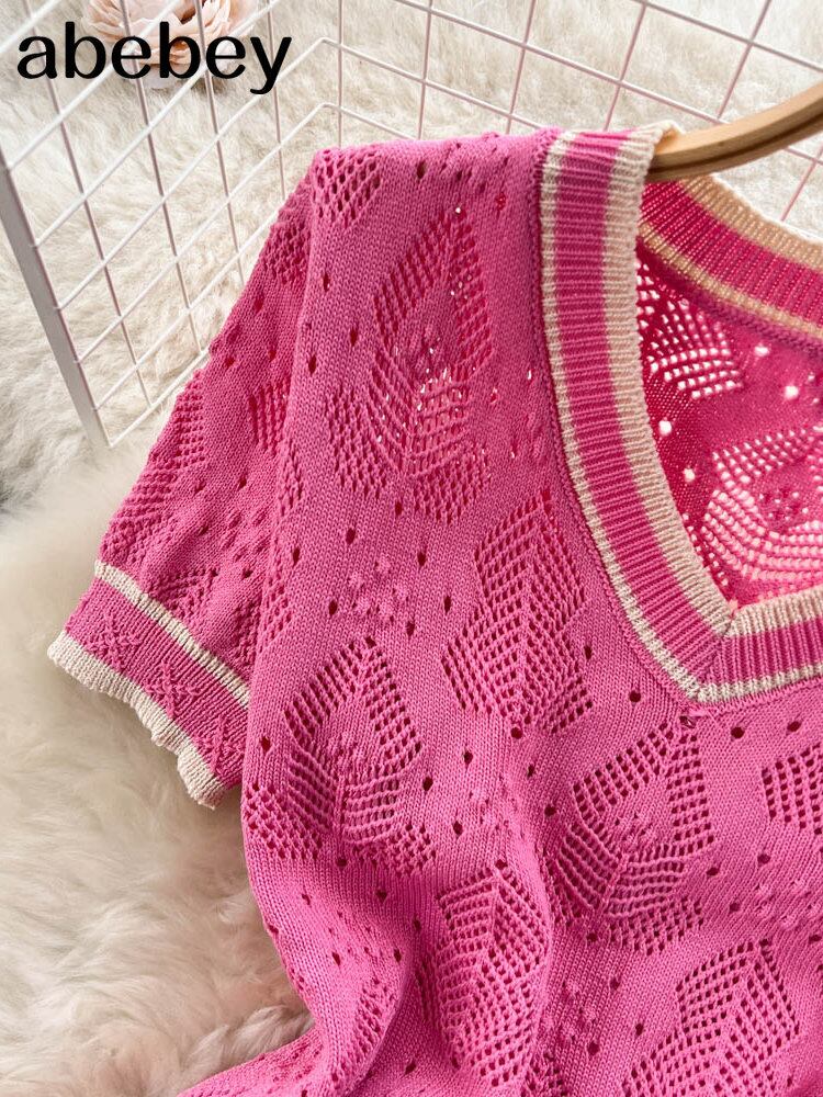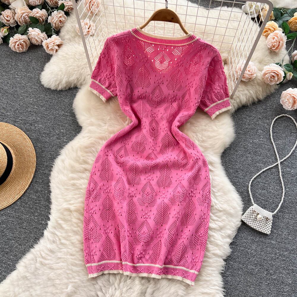 ピンク夏ニットビーチショートドレス半袖 V ネック弾性ボディコンサンドレスストリートスリムセクシーミニドレス ハーフスリーブ エラスティック 伸縮 サマー 夏物 Vネック