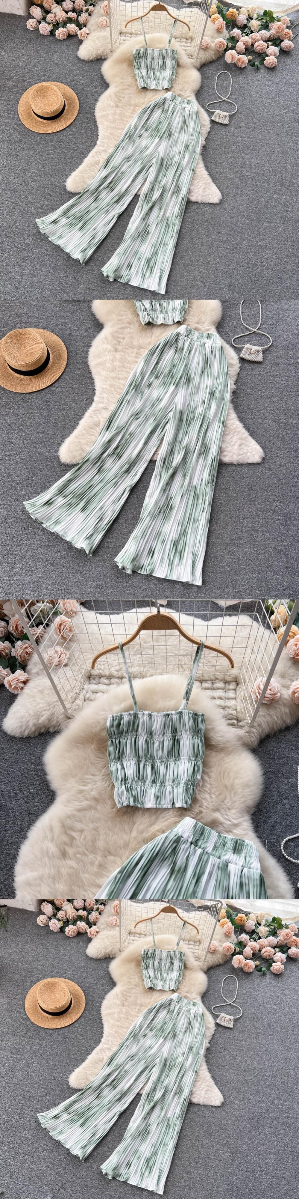夏花シフォンビーチ 2 個セットストラップセクシーキャミソール + ワイドレッグロングパンツバタフライプリントツーピーススーツ サマー 夏物 花柄 ワイドパンツ
