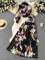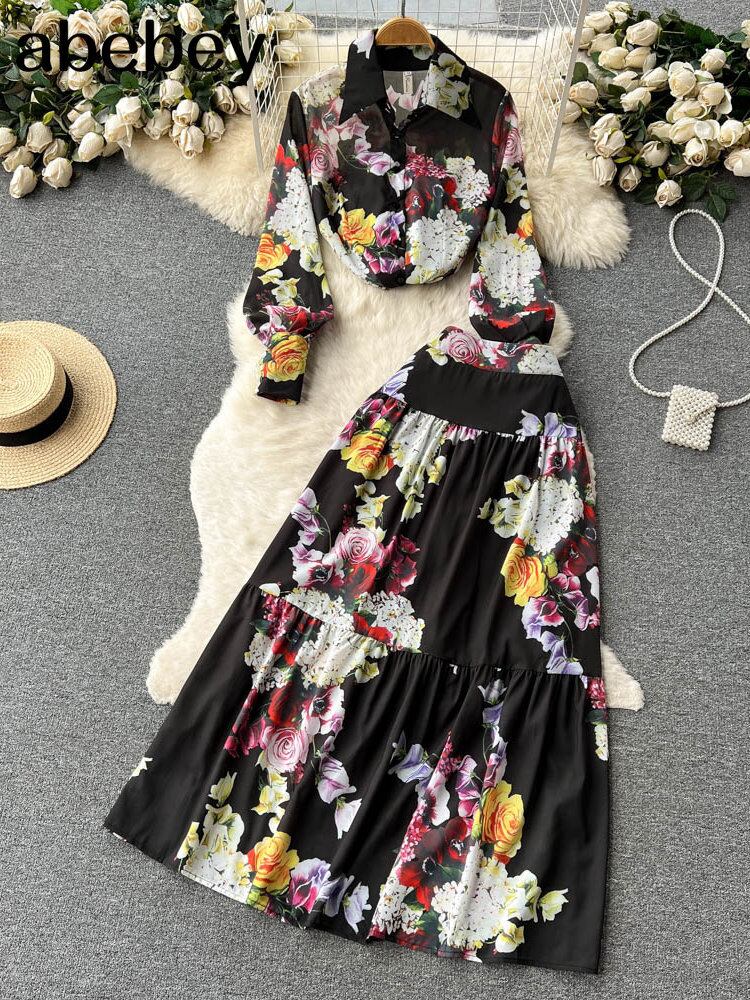 シフォン花柄ツーピーススーツ夏長袖甘いブラウス + ロングスカートストリートビーチボヘミアンセット 大人ガーリー スウィート キュート カジュアル サマー 夏物
