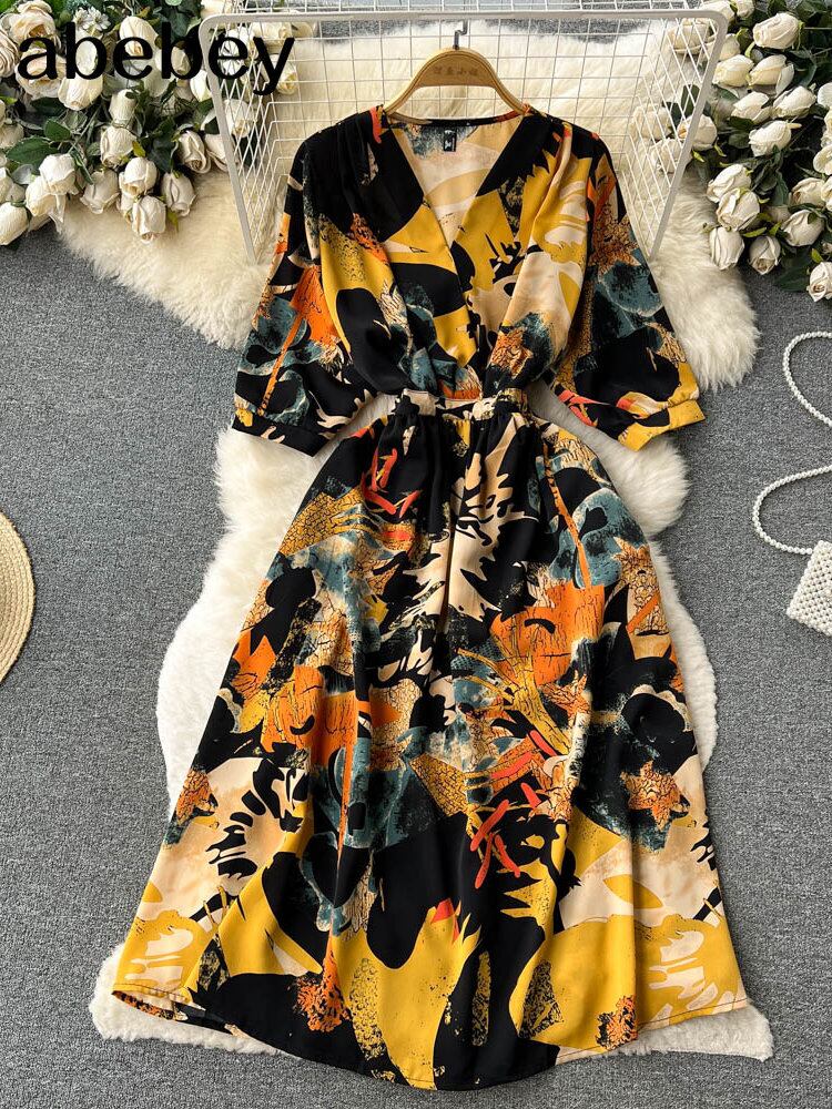 夏休日花ビーチ ラップ ドレス V ネック半袖シック A ライン ドレス ボヘミアン プリント ロング ドレス ショート ハーフスリーブ サマー 夏物 花柄 Vネック Aライン
