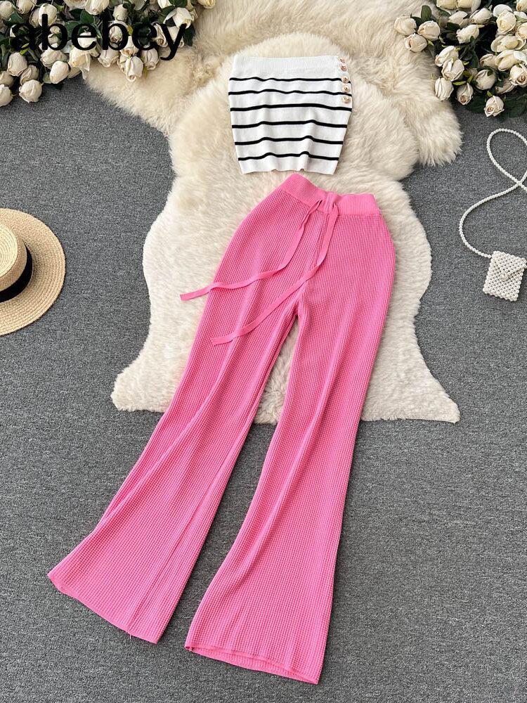 ピンクストリップセクシーツーピースセット夏ストラップレススリムキャミソール + ワイドレッグロングパンツセットストリートツーピーススーツ サマー 夏物 ワイドパンツ