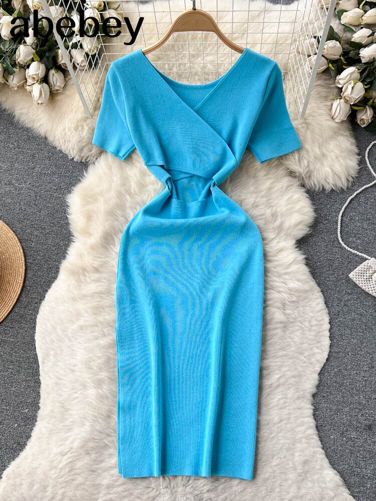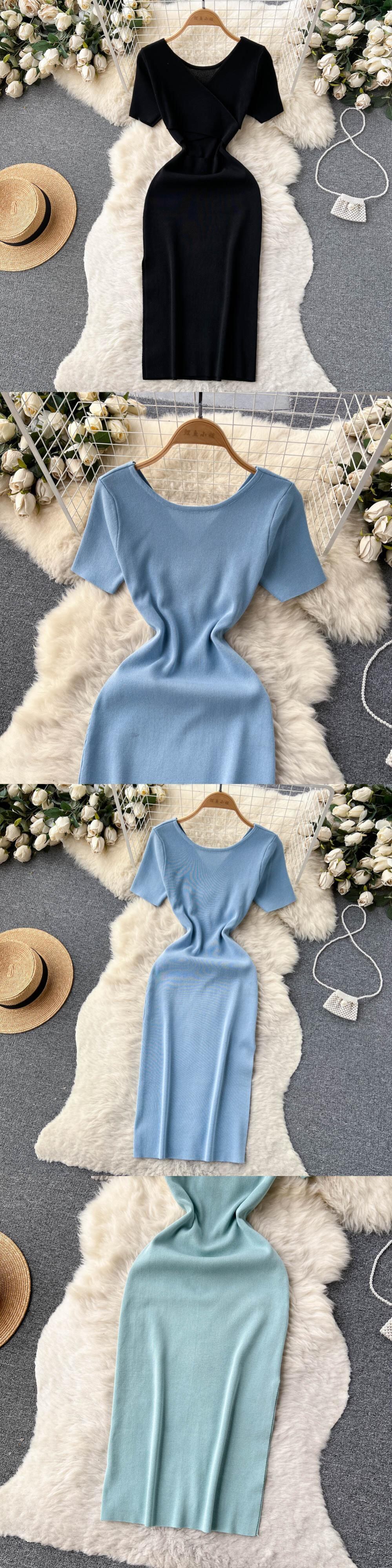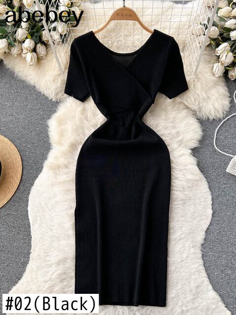 ニットペンシルドレス中空アウト半袖弾性スリムシースドレス夏シックストリートショートドレス ハーフスリーブ エラスティック 伸縮 サマー 夏物