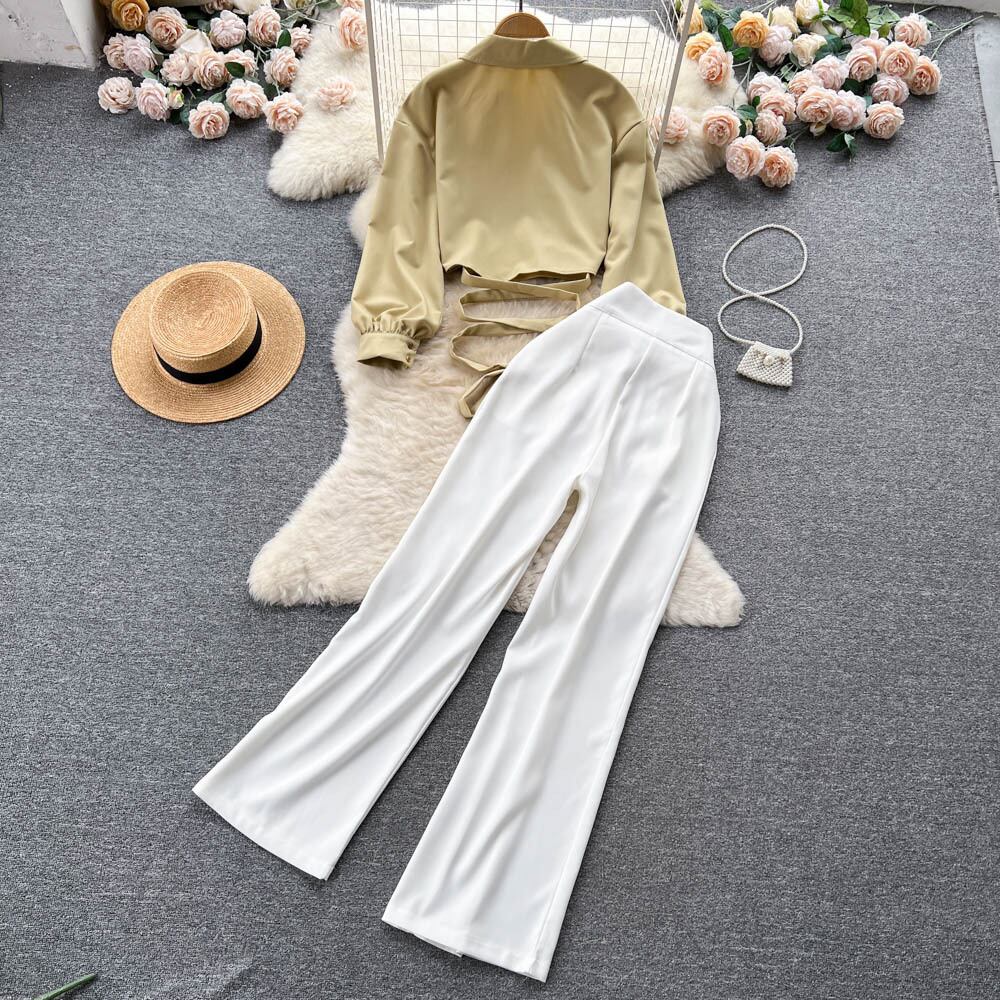 ツーピーススーツ 半袖ブラウス+ワイドレッグパンツ 無地 レディース シニア 春 セット ショート ハーフスリーブ スプリング 春物 ワイドパンツ ソリッドカラー