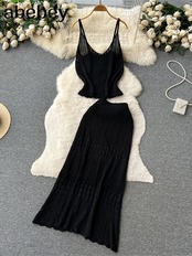 夏ニット休暇ツーピーススーツノースリーブキャミソールトップス + 弾性スリムミディロングスカートビーチセット エラスティック 伸縮 サマー 夏物