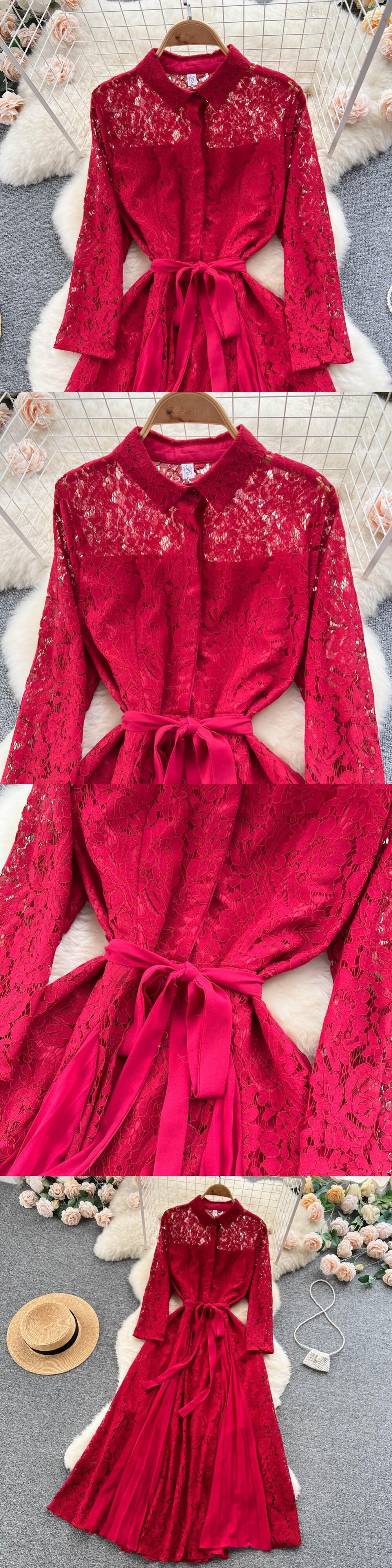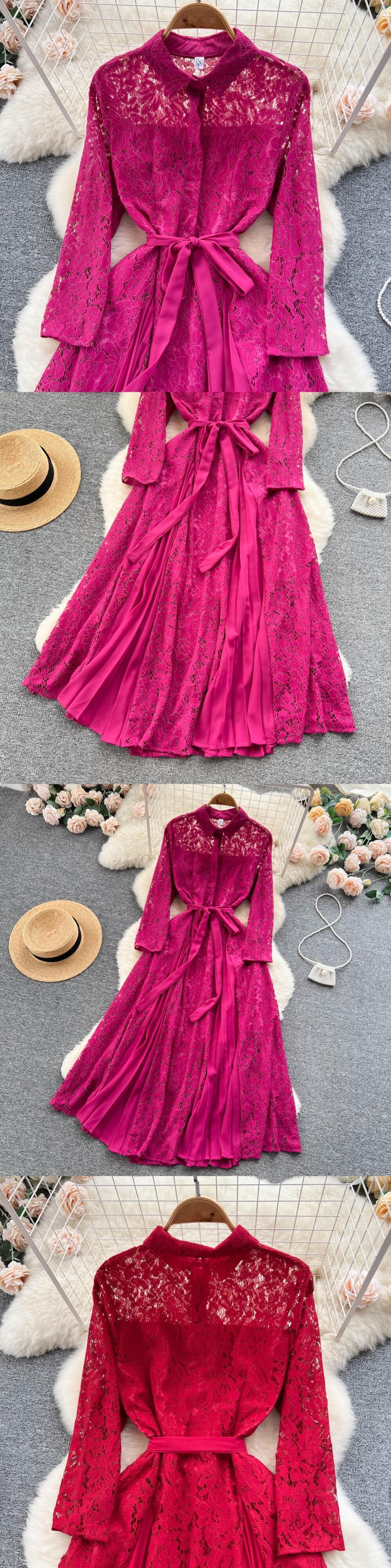 春ソリッド中空アウトレースドレスレトロ水溶性レース長袖シングルブレストタイアップローブ ロング スプリング 春物 ソリッドカラー