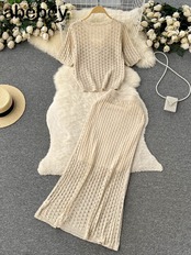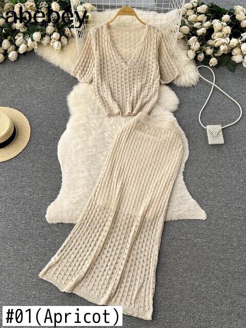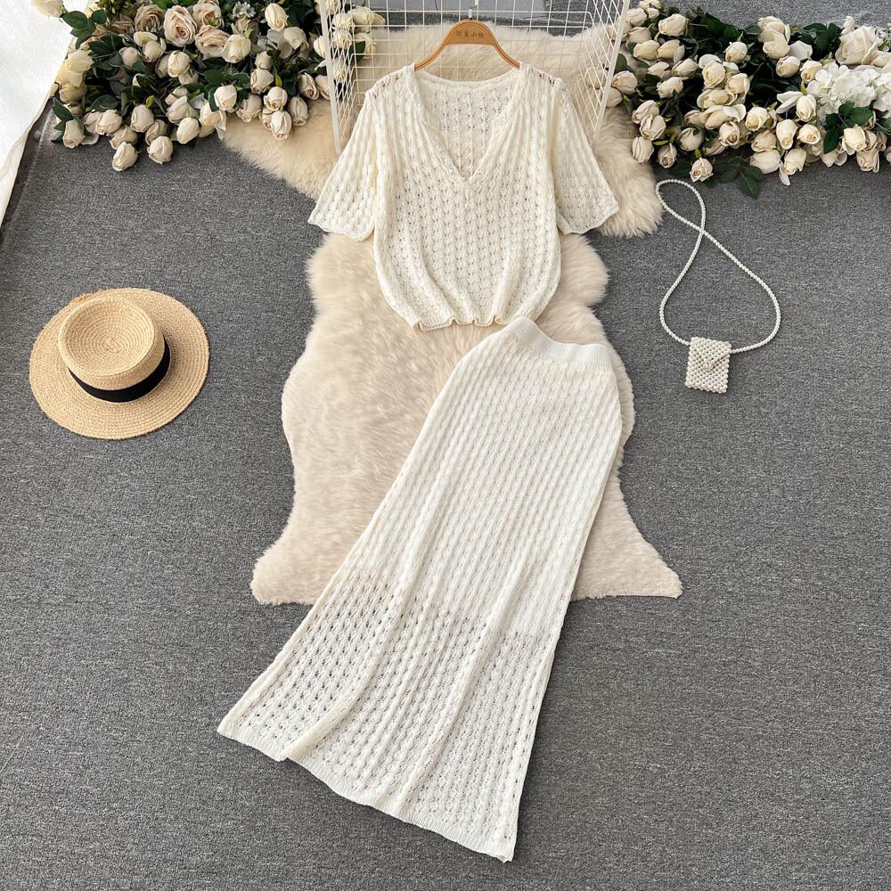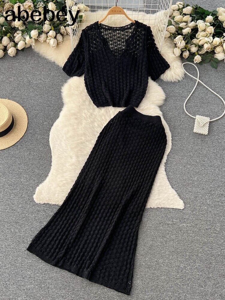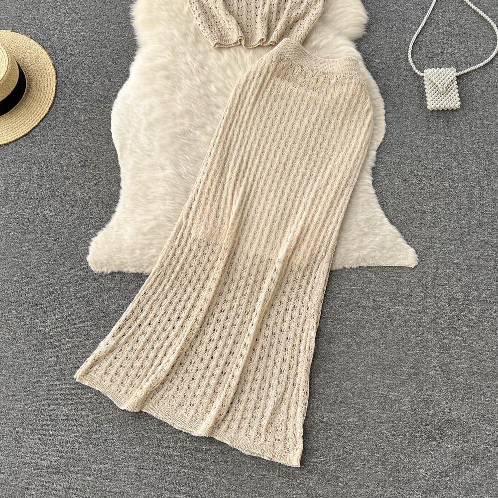 夏ニット休暇ツーピーススーツ半袖クロップトップス + 弾性スリムミディロングスカートビーチセット ショート ハーフスリーブ エラスティック 伸縮 サマー 夏物