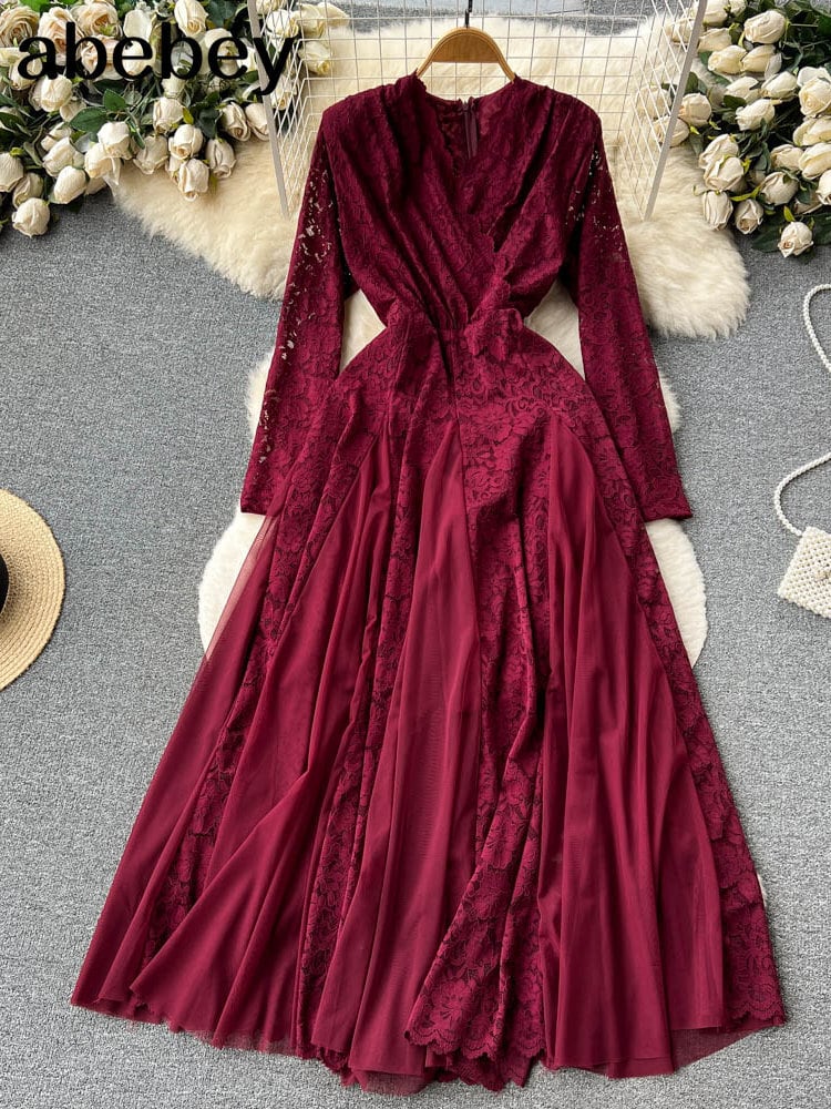 休日スタイル足首長さロングドレス春 V ネックパフスリーブレースイブニングパーティーサマードレス スプリング 春物 夏物 Vネック