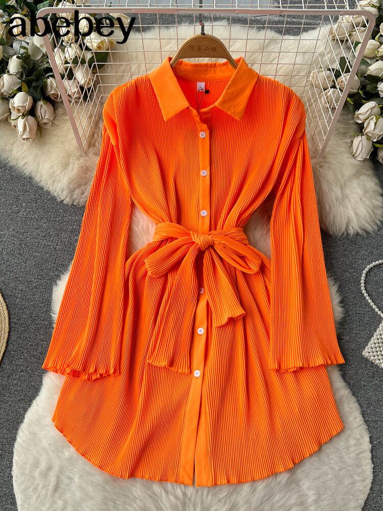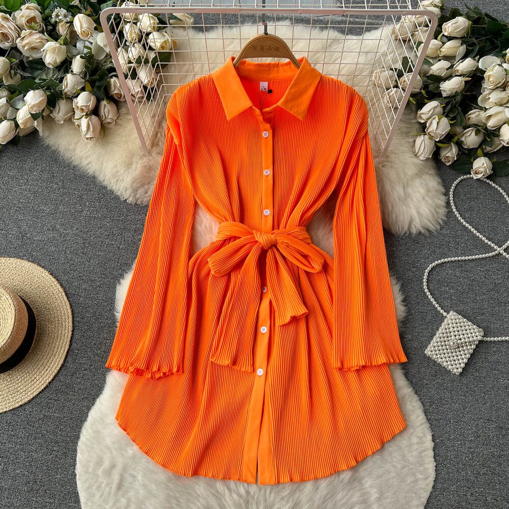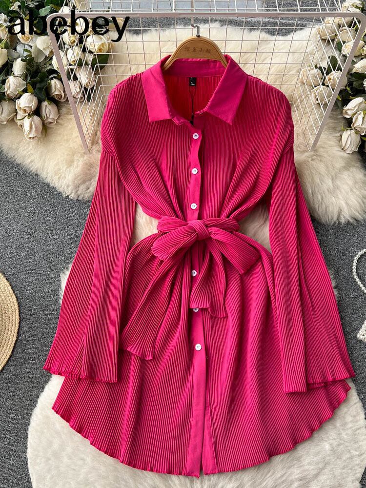 シフォンサンドレスロングフレアスリーブターンダウンカラージェントルルーズプリーツストリートオフィスレディドレス レッド 会社 学校 通勤や通学にも