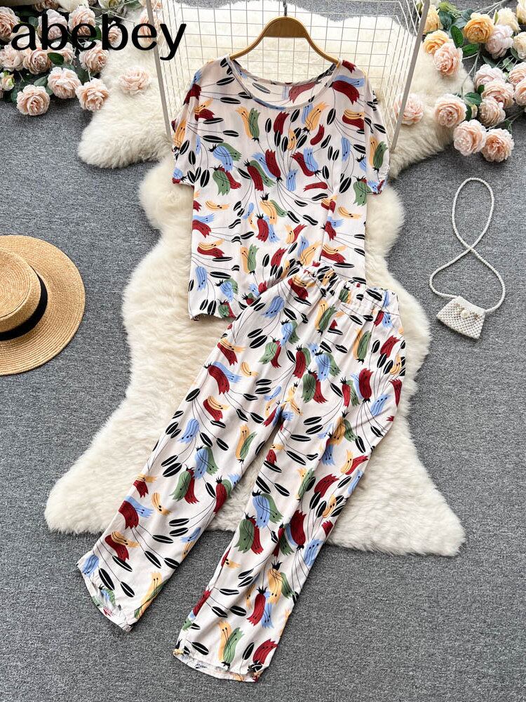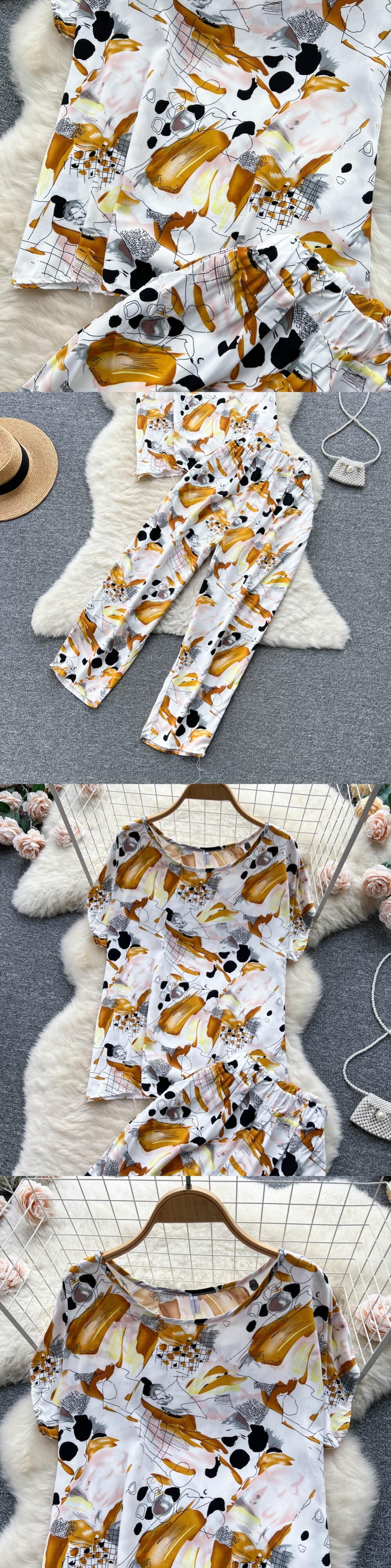休暇スタイルプリントセット O ネックルーズトップス + ワイドレッグロングパンツ春秋ツーピーススーツ スプリング 春物 オータム 秋物 Oネック ワイドパンツ