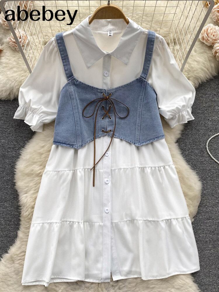 2点セットサマーウエストドレスデニムキャミソール+ミニドレスパフスリーブAラインドレススリムドレス 夏物