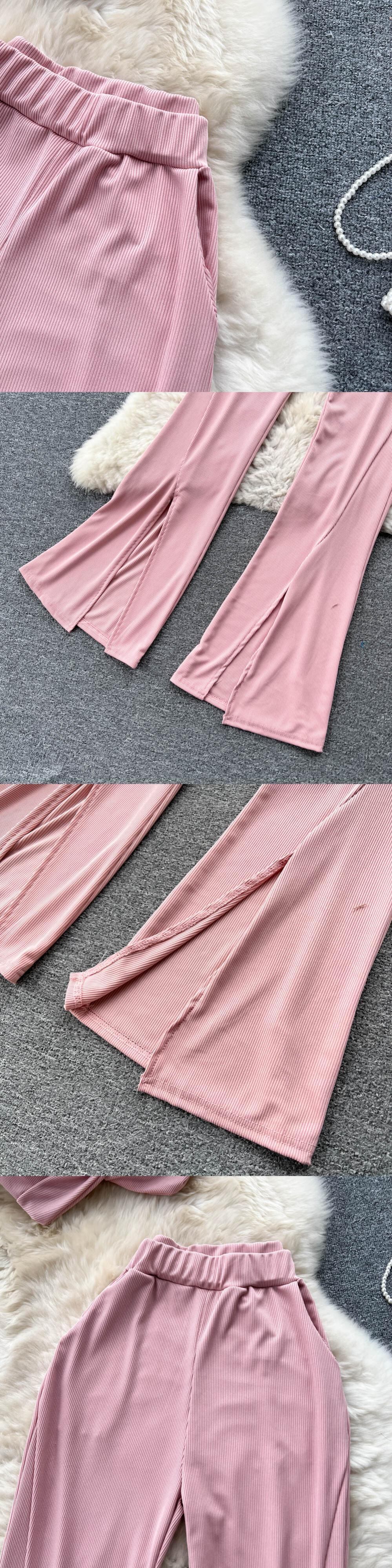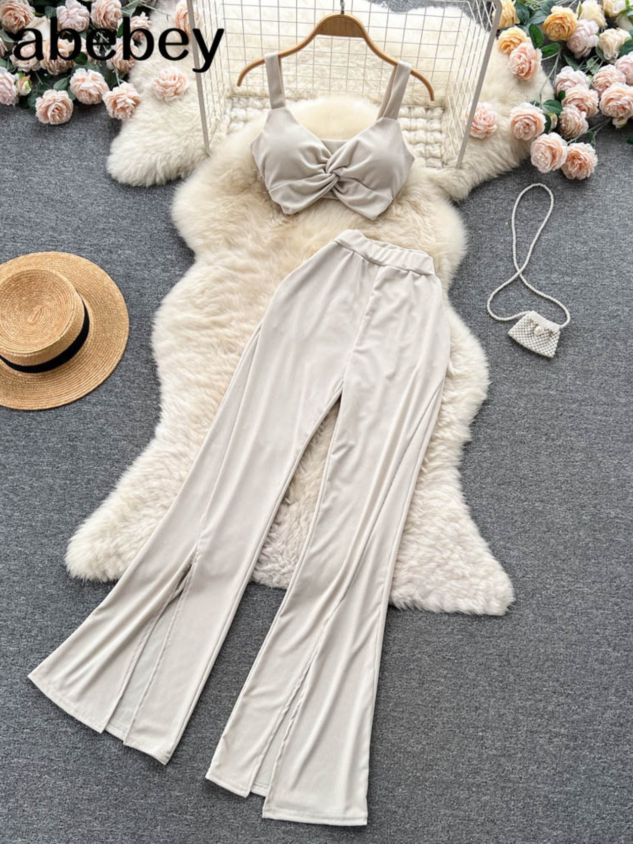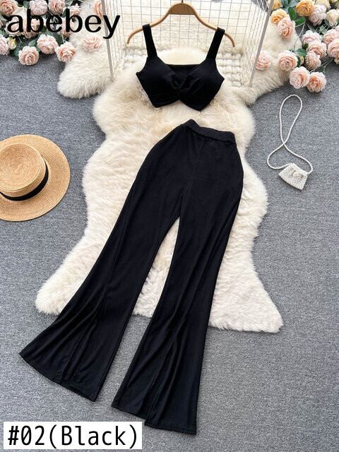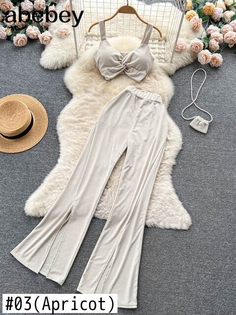 ストラップセクシースーツ中空アウトキャミソール + ワイドレッグロングパンツセットアメリカレトロビーチ二枚トラックスーツ ワイドパンツ