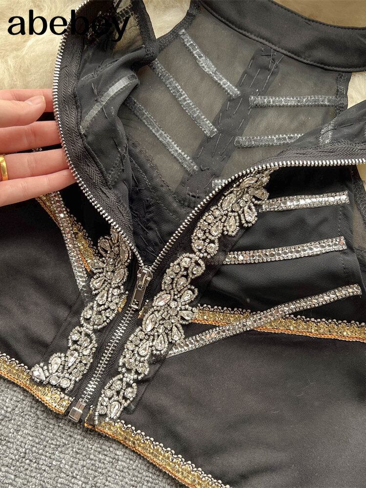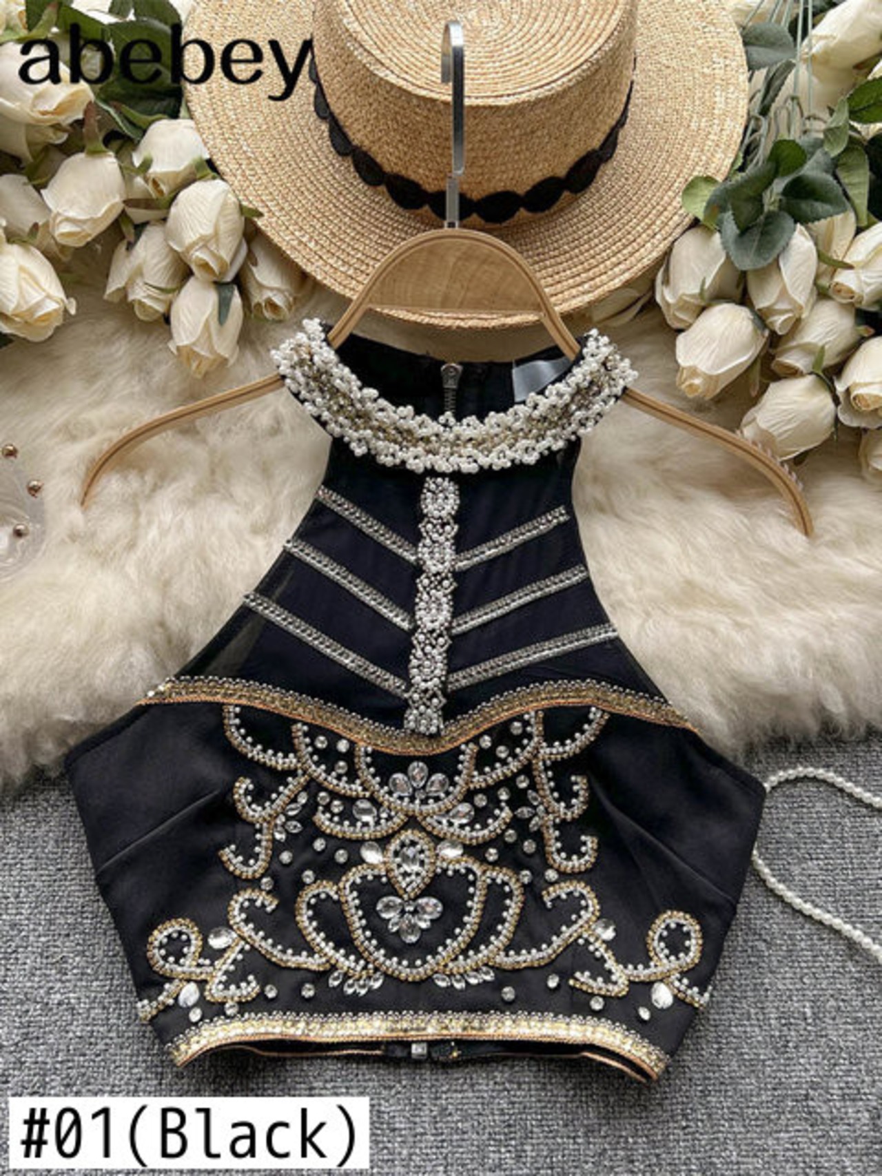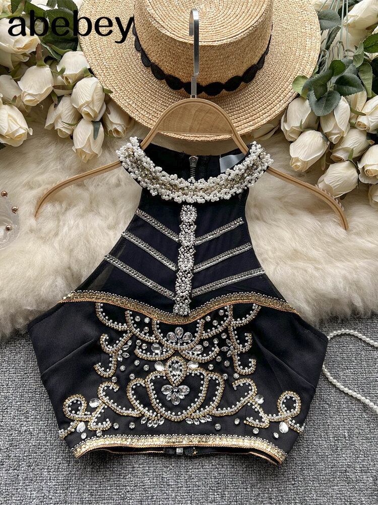 夏ホルター シアー セクシー キャミソール ビーズ トップ ストリート Y2K ノースリーブ ブラック メッシュ バックレス タンクトップ サマー 夏物