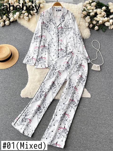 プリントスーツ職業 V ネックルーズ長袖ブラウス + ワイドレッグパンツセット春ツーピーススーツ ロング スプリング 春物 Vネック ワイドパンツ
