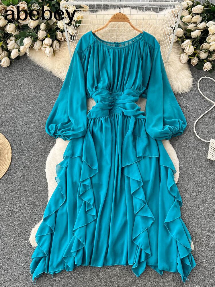 ドレス無地シャーリングスリムロングドレスランタンスリーブフリルドレス ラッフル ソリッドカラー