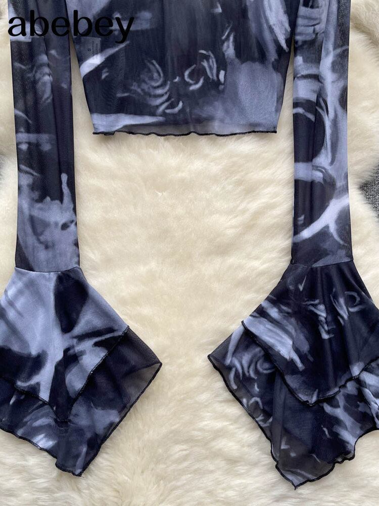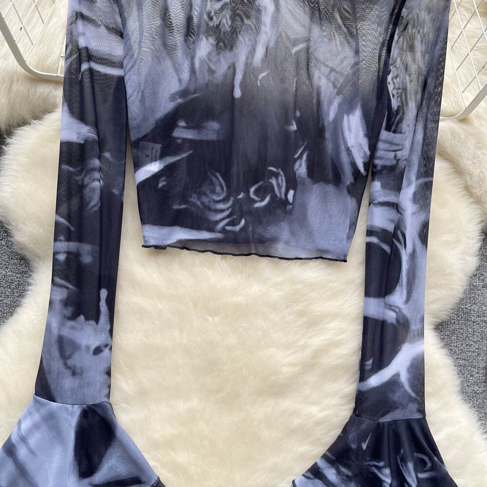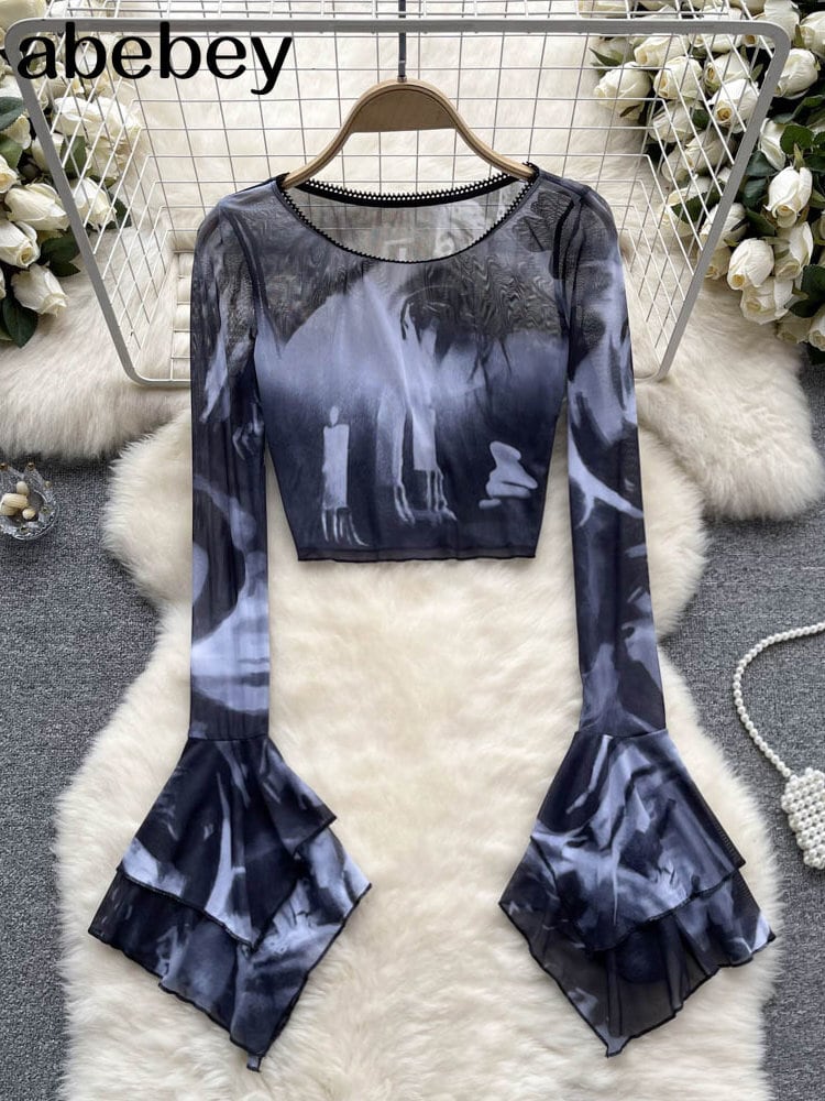 Y2k シースルートップスメッシュブラウスプリントラウンドカラー夏長袖メッシュクロップトップス ロング サマー 夏物
