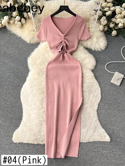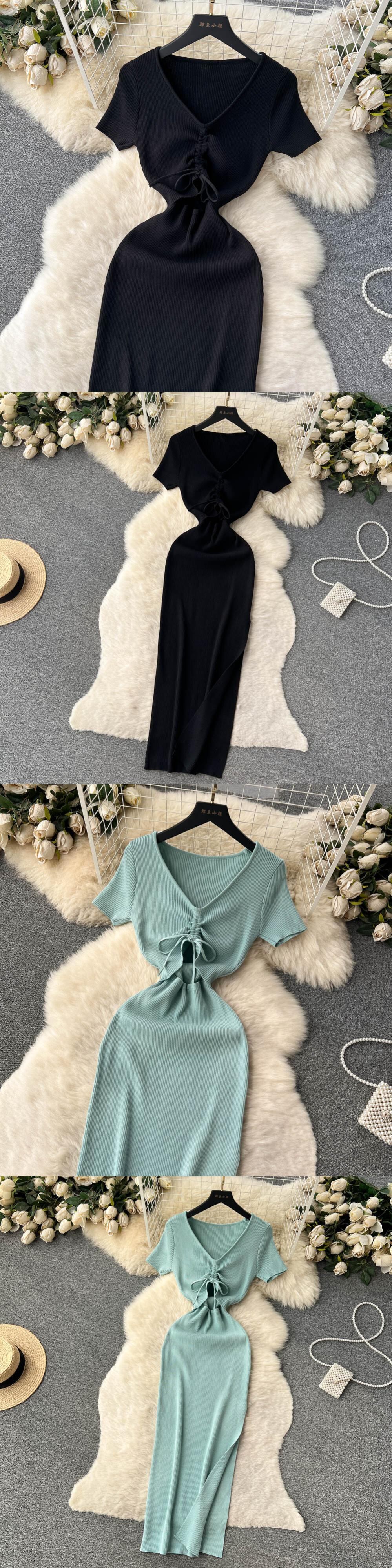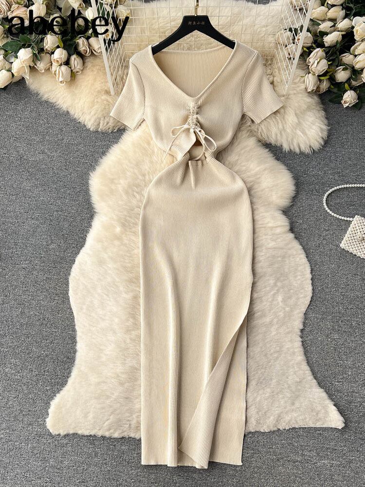夏ニットセクシーストラップドレス中空弾性ウエストボディコンサンドレスビーチスプリットロングドレス サマー 夏物