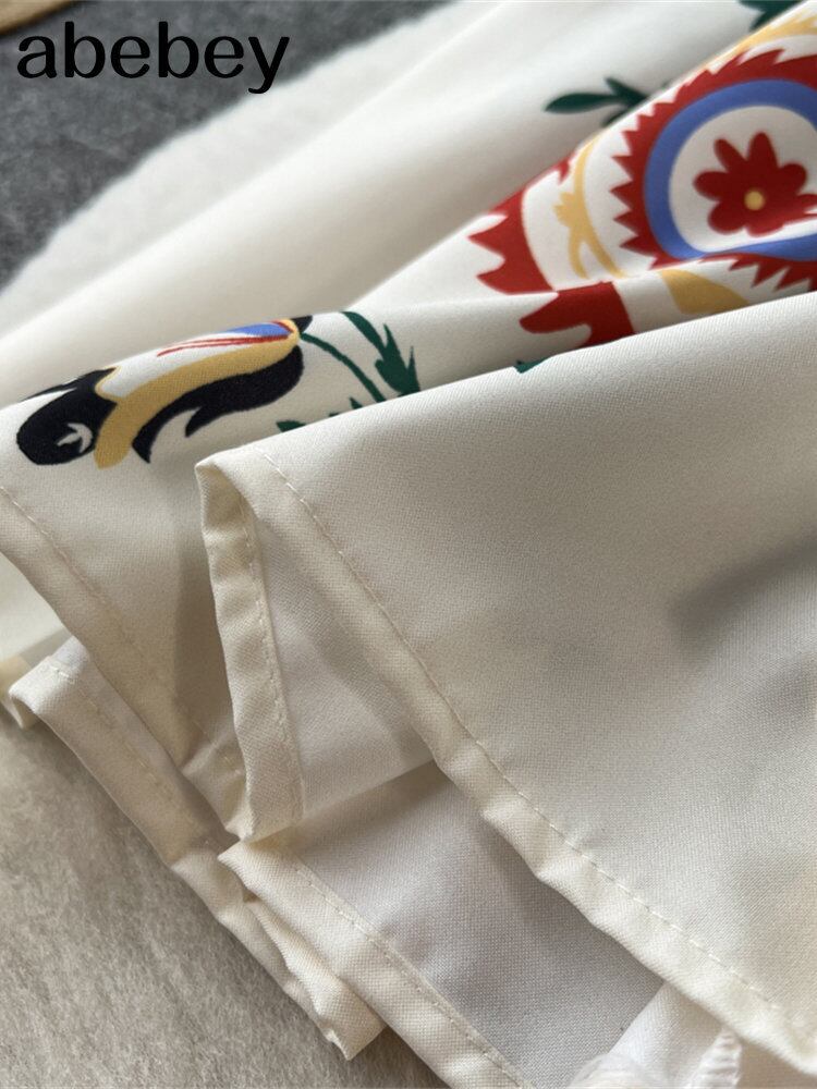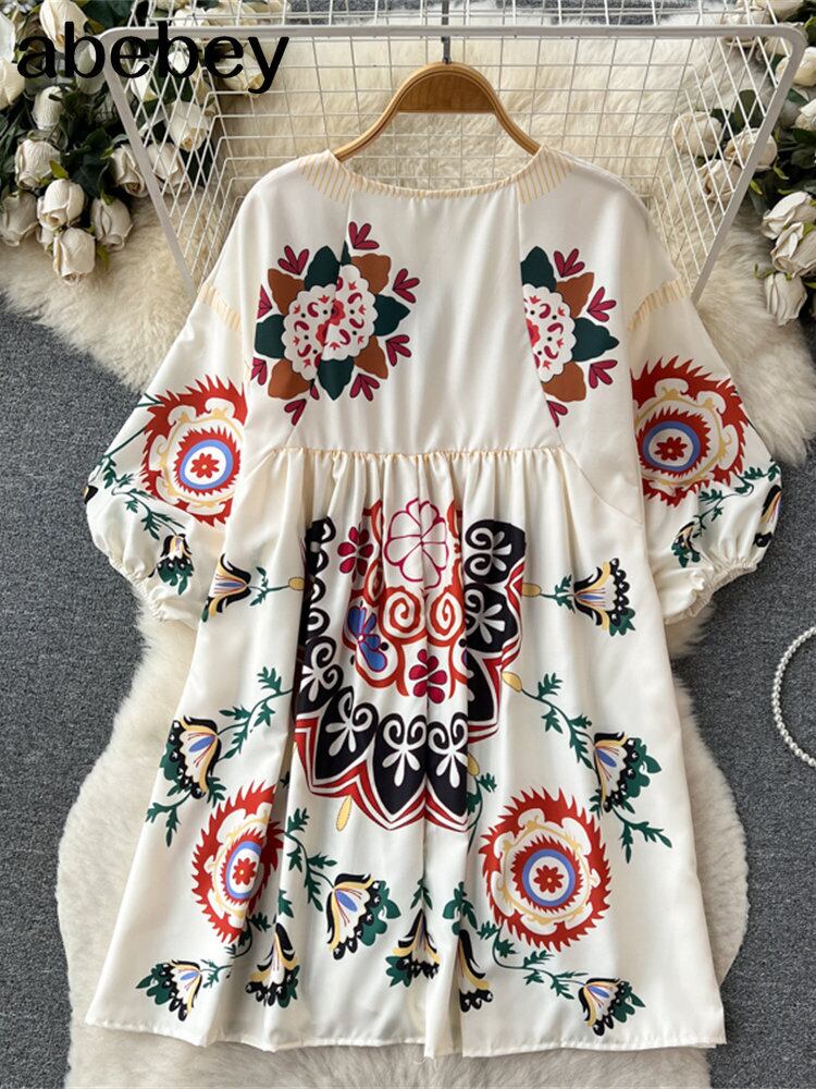 春夏ボヘミアンドレスレトロエスニックスタイルプリント V ネックウエスト A ラインシーサイドホリデースイングミディ Vestidos ドレス スプリング 春物 サマー 夏物 Vネック Aライン