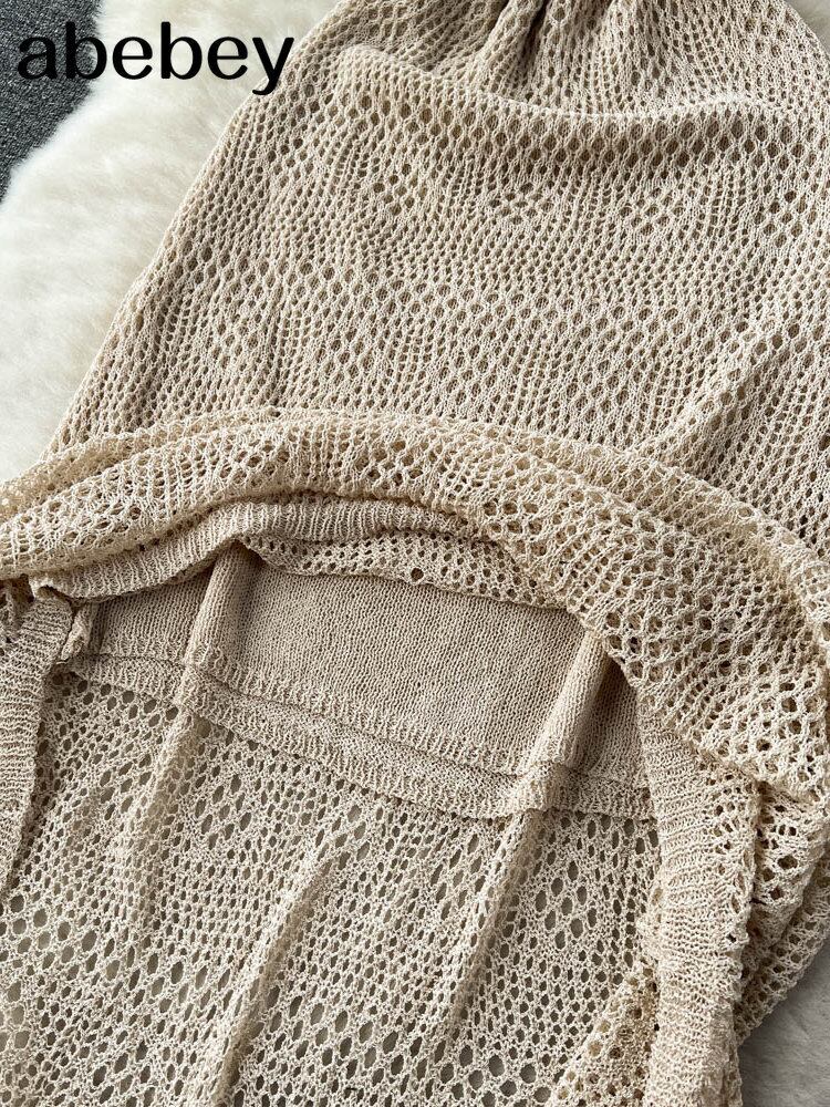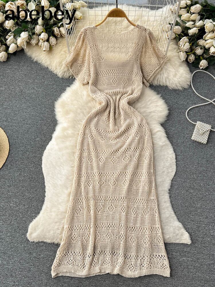 半袖ニットドレス夏弾性ウエスト U ネック中空アウトロングドレス ショート ハーフスリーブ エラスティック 伸縮 サマー 夏物