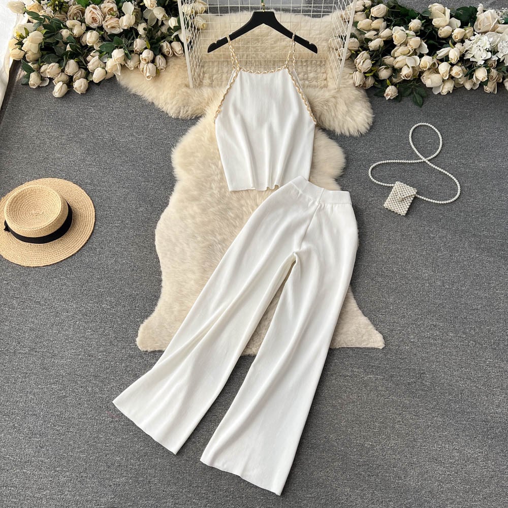 ストラップセクシースーツ中空アウトキャミソール + ワイドレッグロングパンツセットアメリカレトロビーチ二枚トラックスーツ ワイドパンツ