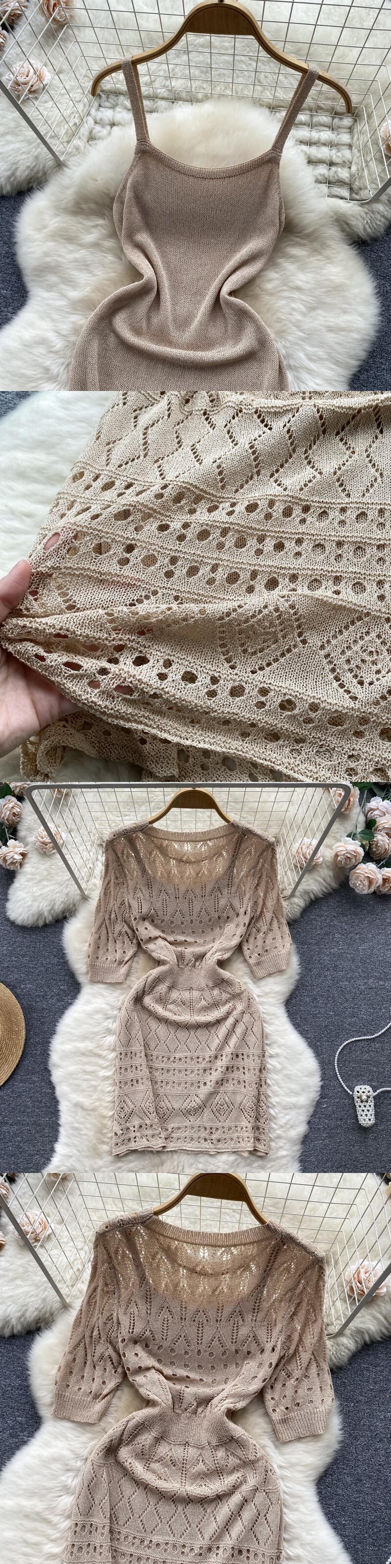 セクシーニットドレス O ネック半袖かぎ針編みドレスカバーアップ中空アウトかぎ針編みビーチドレスカバーアップ ショート ハーフスリーブ Oネック
