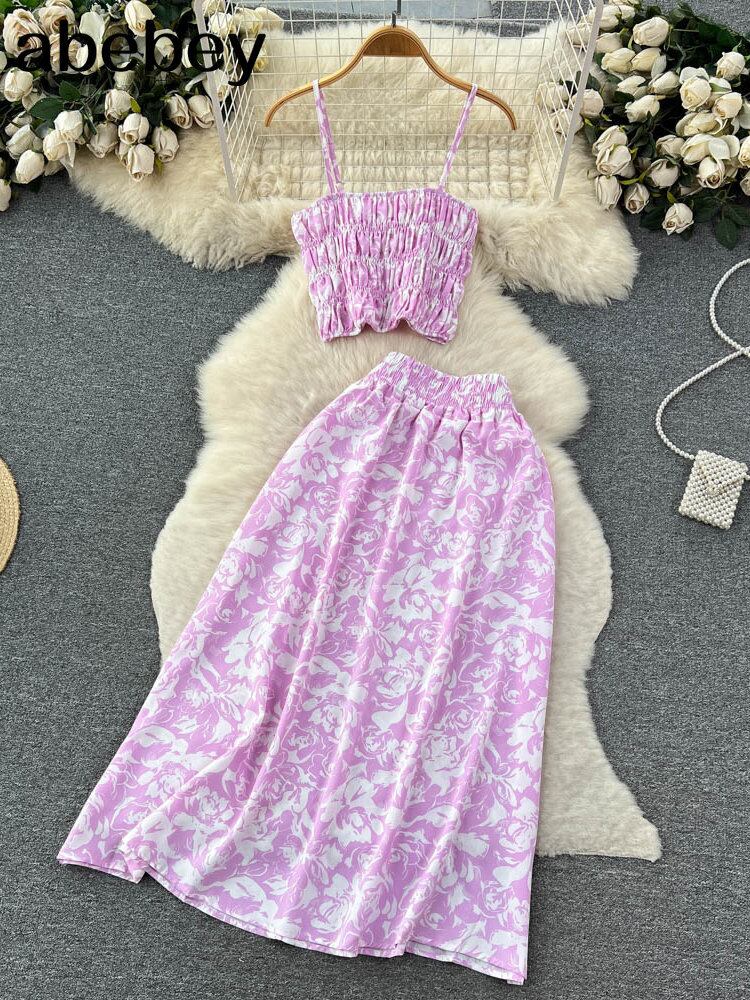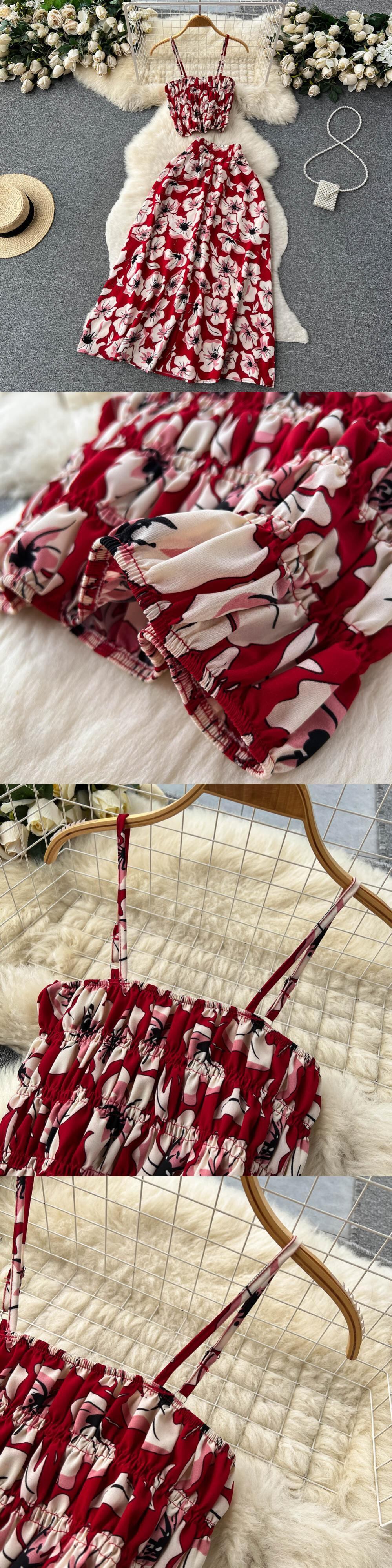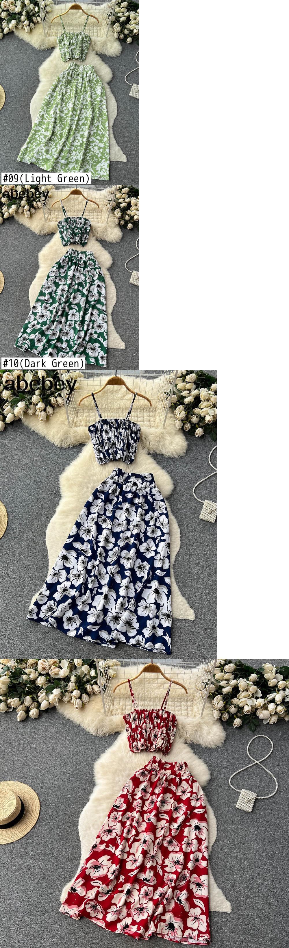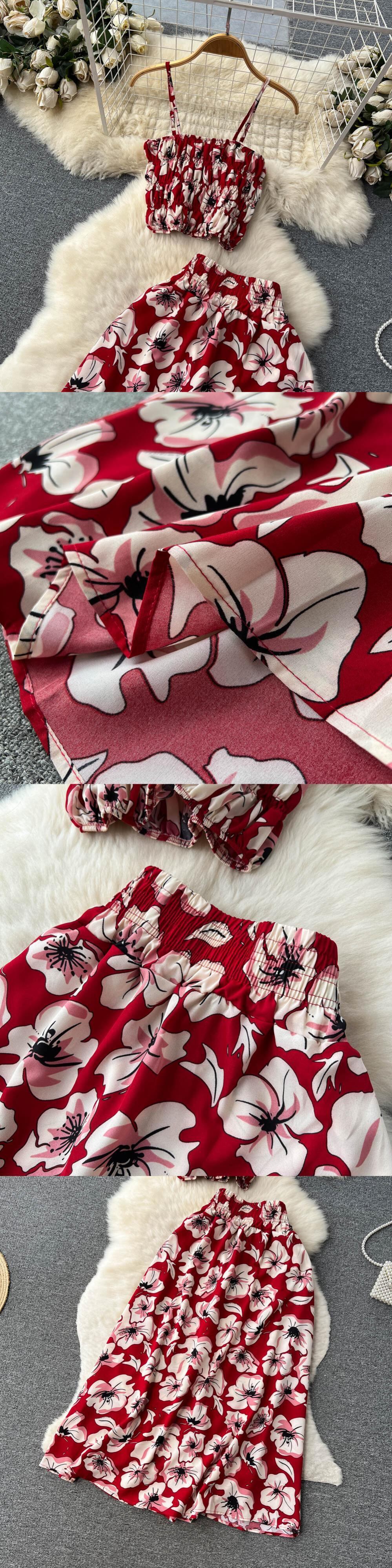 ホリデーフローラルプリントツーピーススーツジッパースリムタンクトップ+ Aラインロングスカートボヘミアンビーチセット 花柄