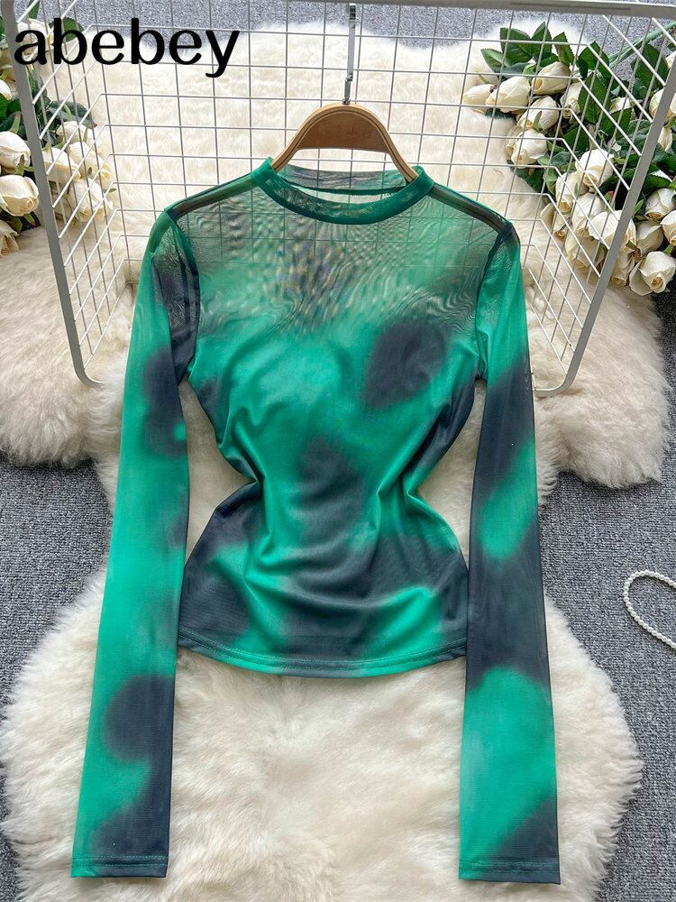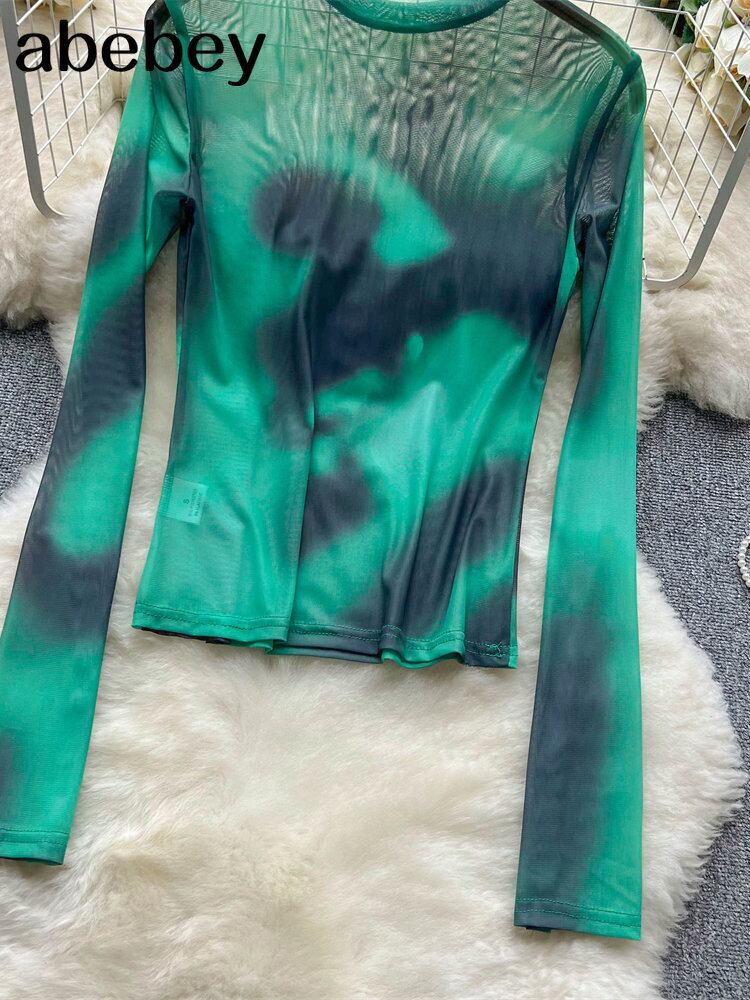 セクシーシートラフクロップトップグラフィックプリントグリーンメッシュシアー Tシャツロングフレアスリーブスリムフィット Tシャツ服