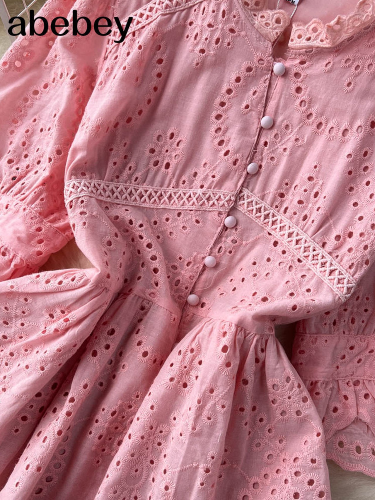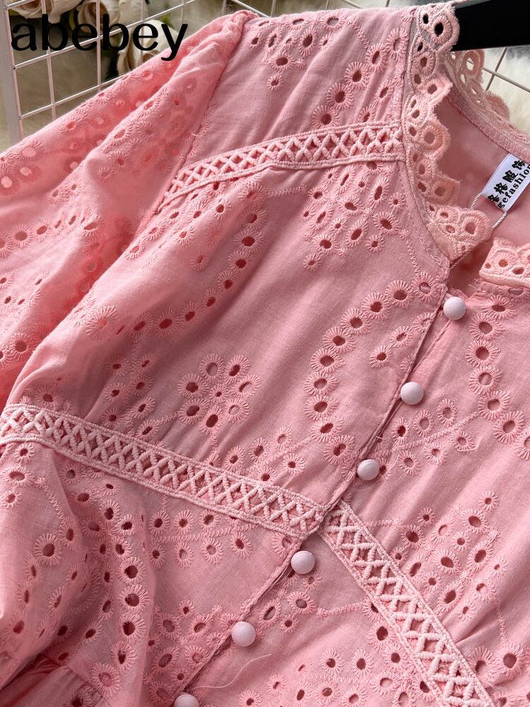 ピンク/ブルーサマーレース刺繍ドレス半袖ドレスパーティービーチマキシロングドレス ショート ハーフスリーブ 夏物