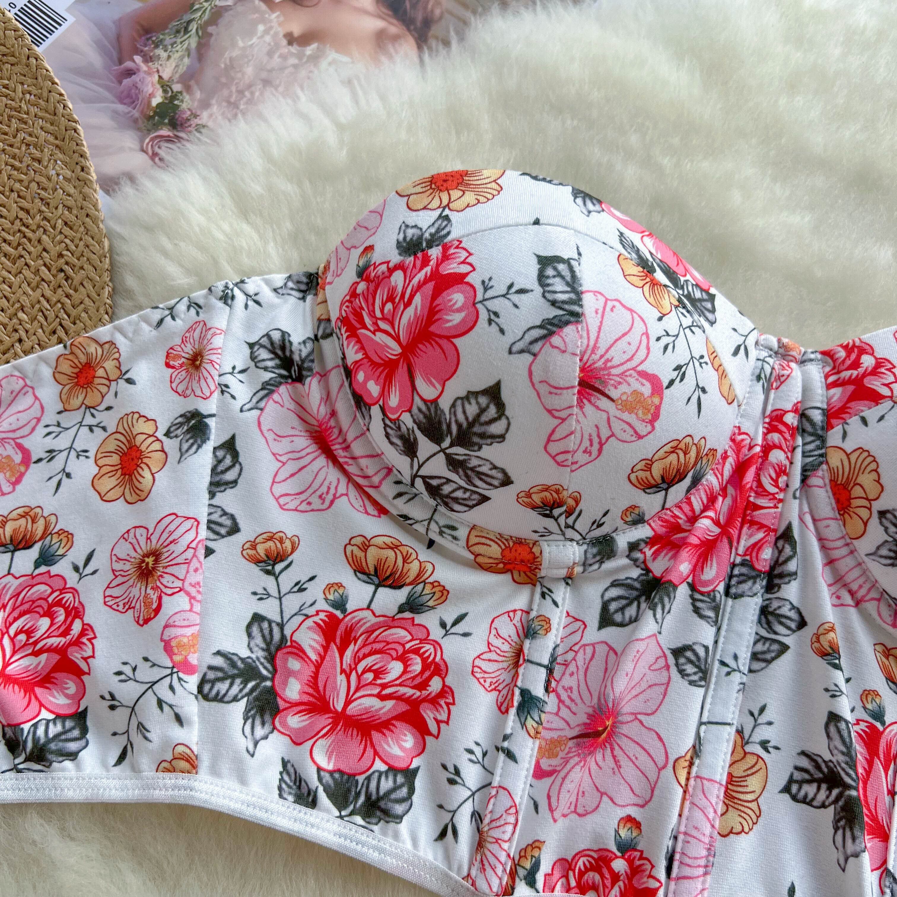 ストラップレスバックレスフローラルプリントトップ弾性ウエストチェスト有料ビーチスタイルクロップトップ エラスティック 伸縮 花柄