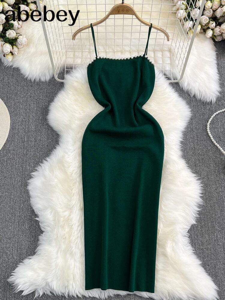 ブルーサマーニットセクシーストラップドレスタンクエラティックウエストボディコンサンドレスビーチバックレスミディドレス 夏物