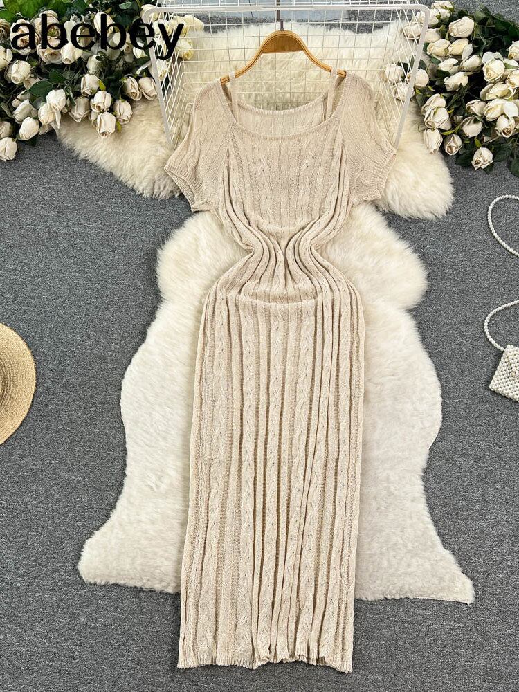中空アウトニットビーチドレスセット半袖弾性スリムボヘミアンサンドレスレトロバケーションボディコンロングドレス ショート ハーフスリーブ エラスティック 伸縮
