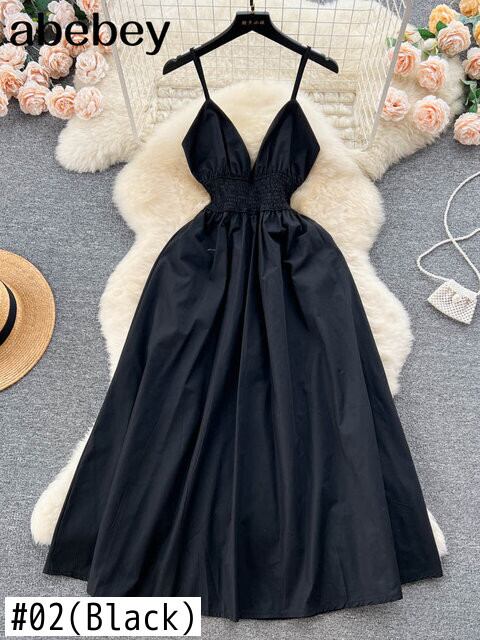 夏セクシー A ライン ドレス ディープ V ネック スリング無地背中開いたプリーツ無地イブニング パーティー ロング ドレス サマー 夏物 Vネック Aライン ソリッドカラー
