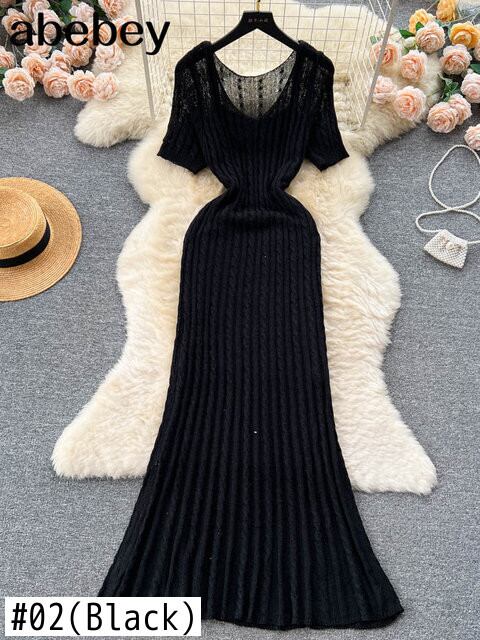 夏ニットボディコンロングドレス半袖スリム二枚ドレス休暇セクシービーチマキシサンドレス ショート ハーフスリーブ サマー 夏物