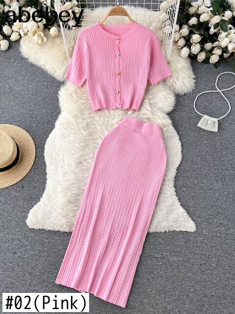 夏ニットツーピーススーツ半袖レースアップブラウス + ロングボディコンスカート中空アウトセット ショート ハーフスリーブ サマー 夏物