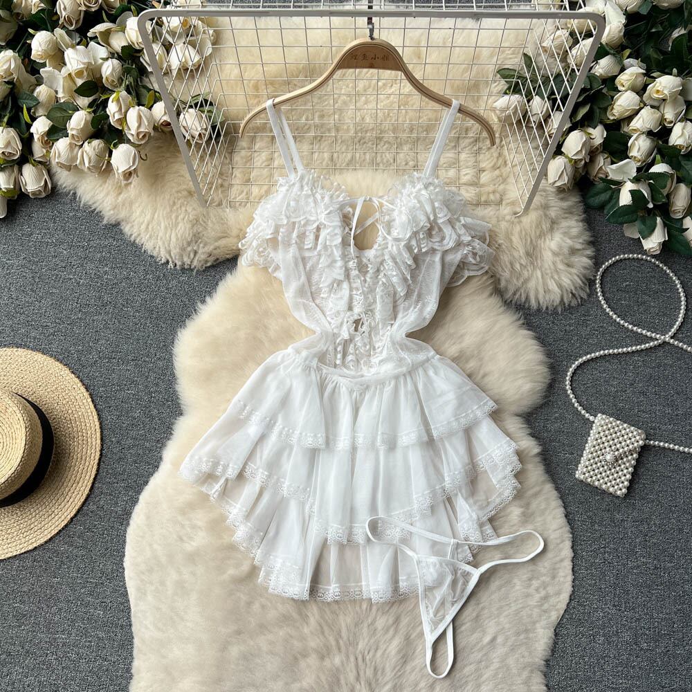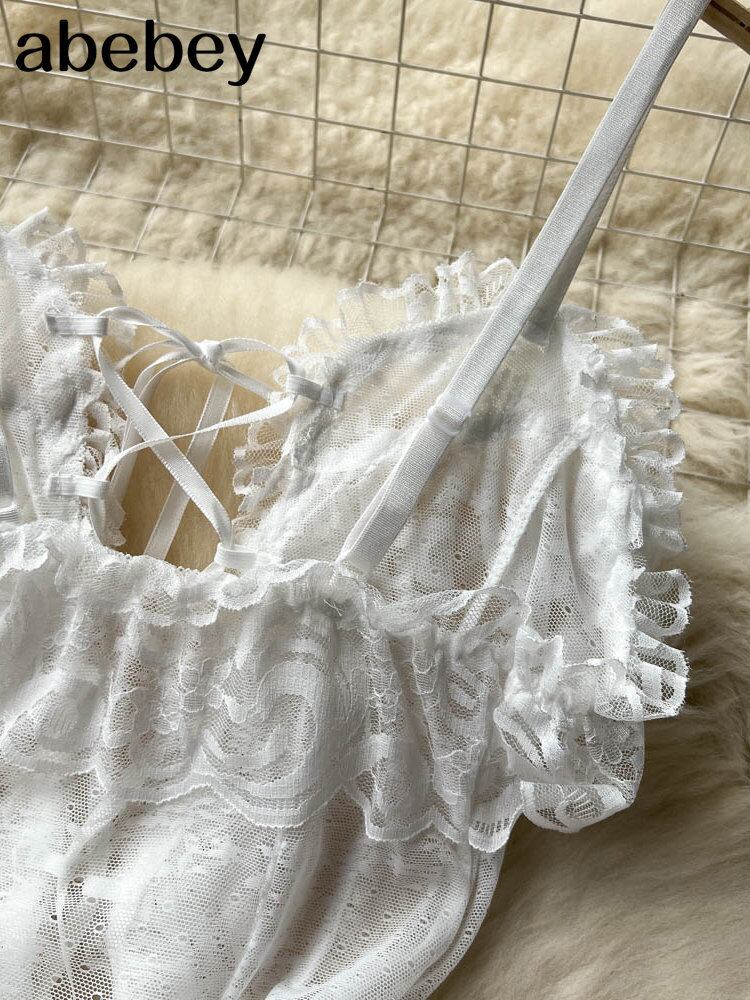 ホワイトメッシュバックレスキャミソールかもしれいドレスランジェリーシェイプウェア透明レースアップスリムパジャマ夏官能的ナイトウェア サマー 夏物