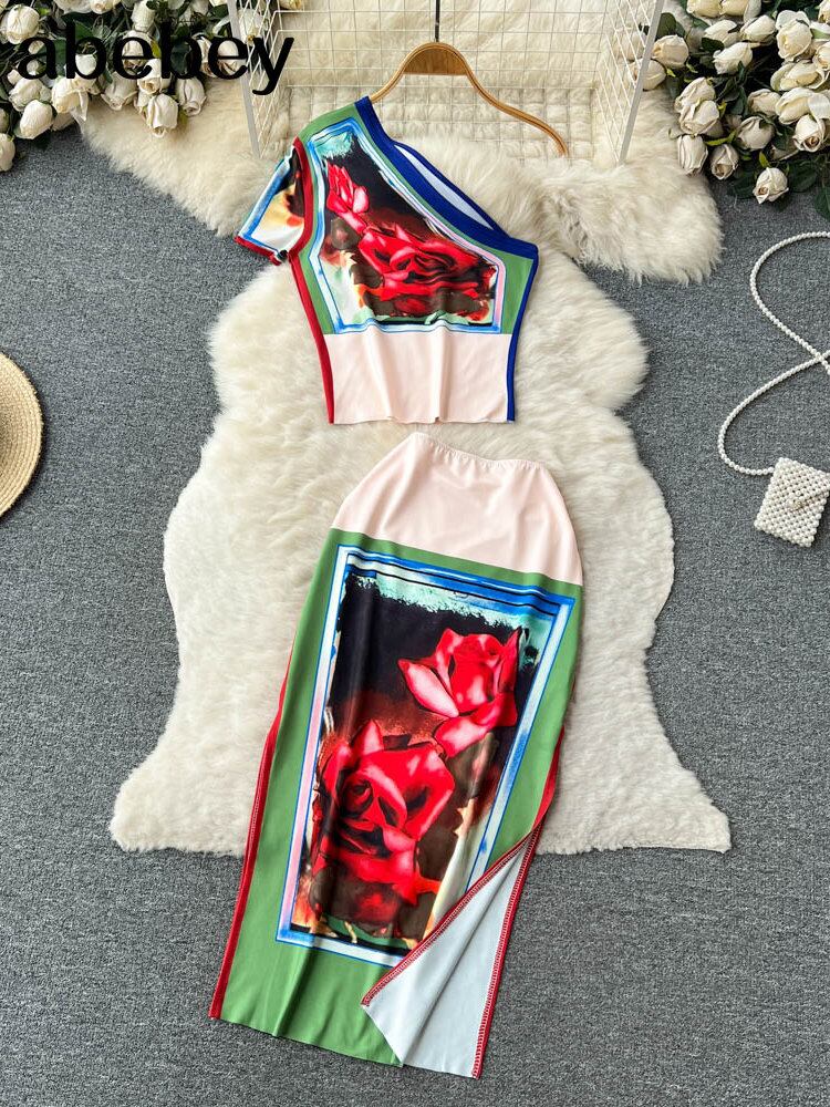 夏ビーチ 2 点セット ワンショルダー ショート ブラウス + ロング セクシースプリット スカート セット グラデーション ボディコン レトロ 2 個スーツ サマー 夏物