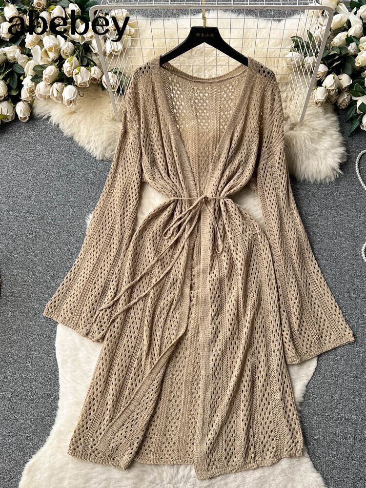 夏中空アウト ビーチ ロング カーディガン花柄ニット ストリート ルーズ カーディガン無地ボヘミアン オーバー コート サマー 夏物 ソリッドカラー