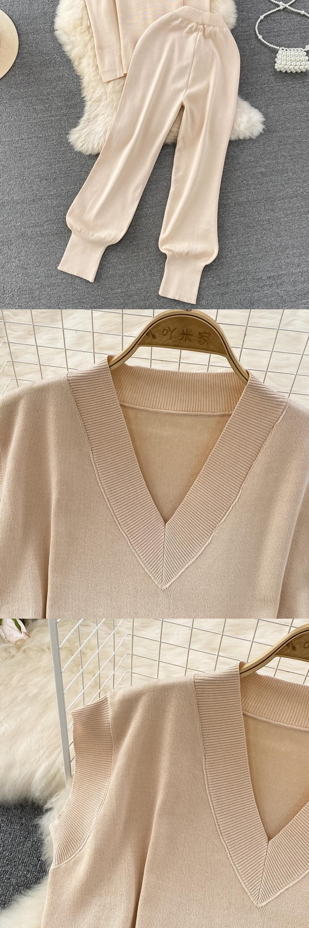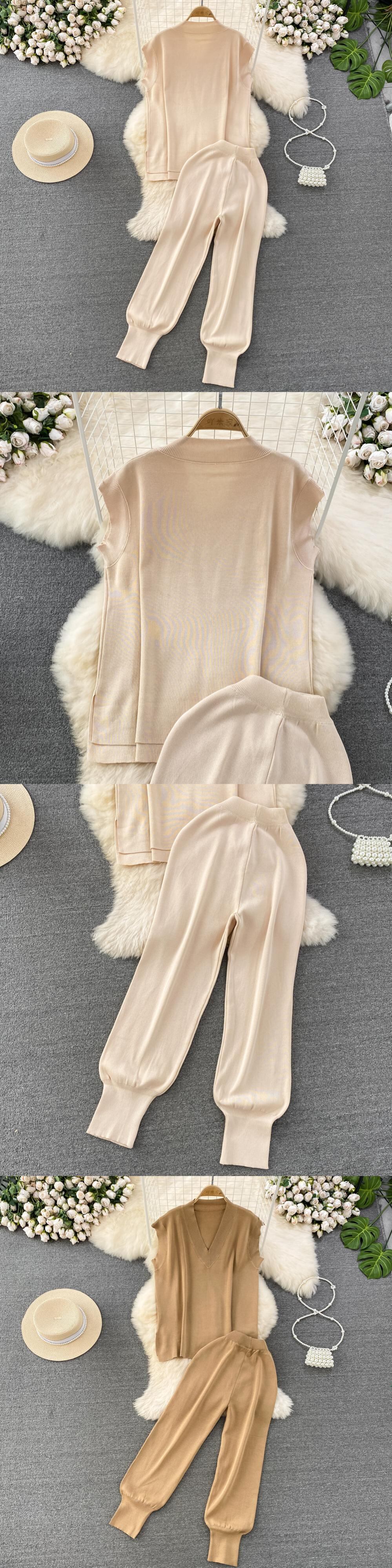 ソリッドベーシック V ネック春夏 Tシャツセットニットルーズツーピースノースリーブトラックスーツレディースパンツスーツ スプリング 春物 サマー 夏物 Vネック ソリッドカラー