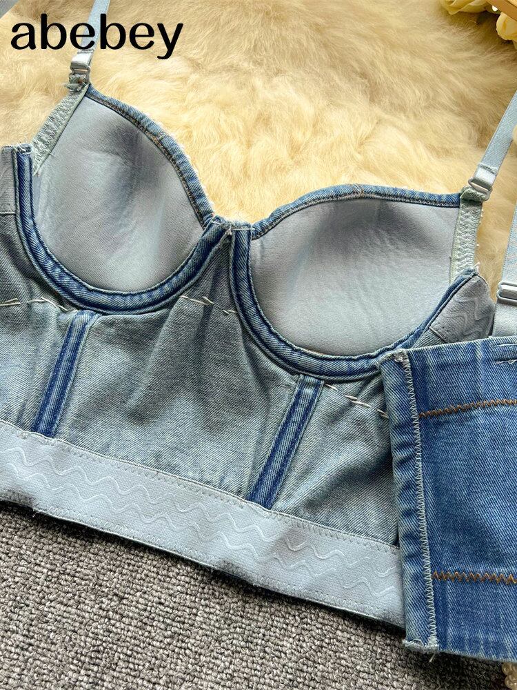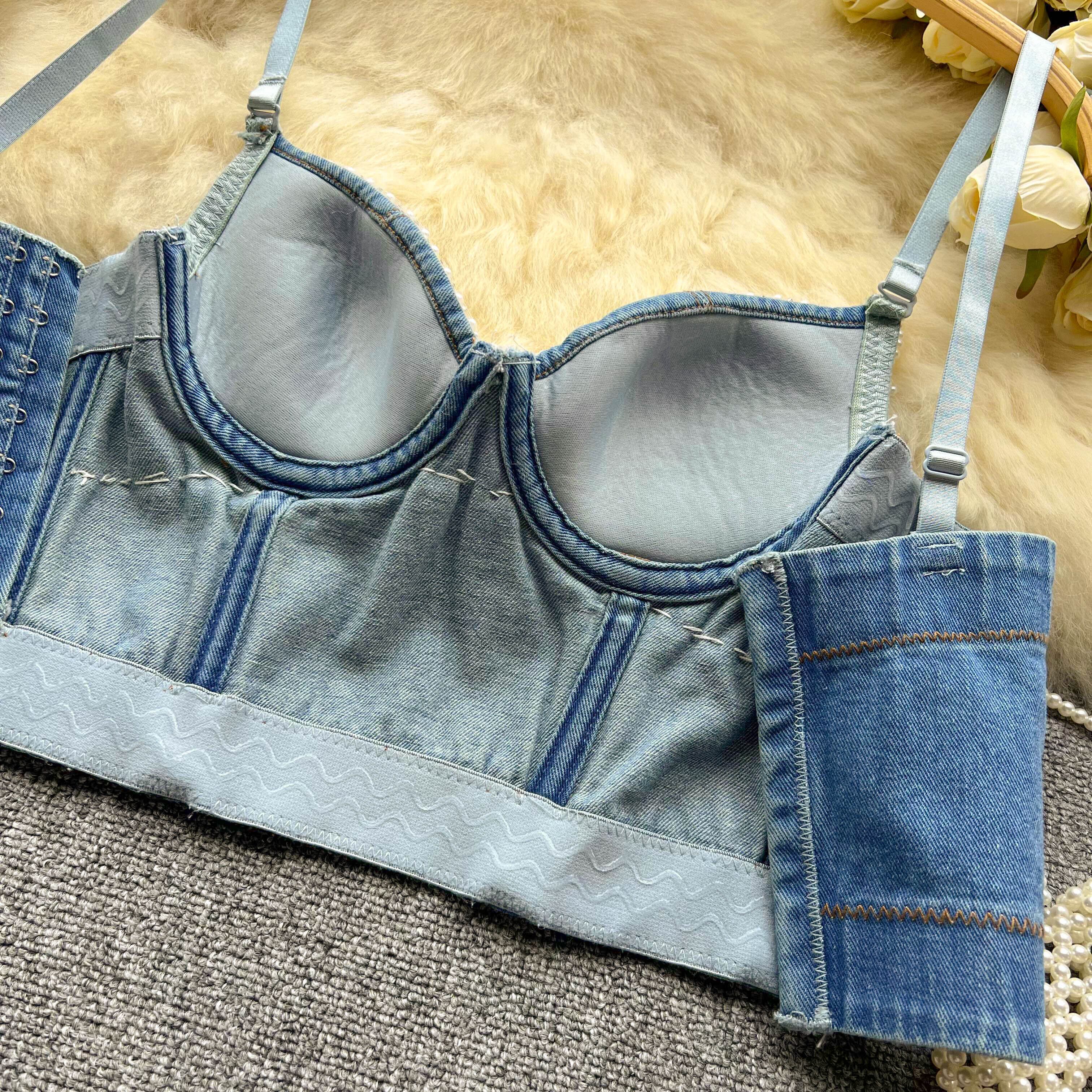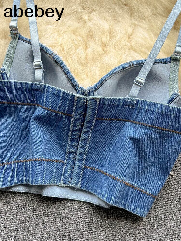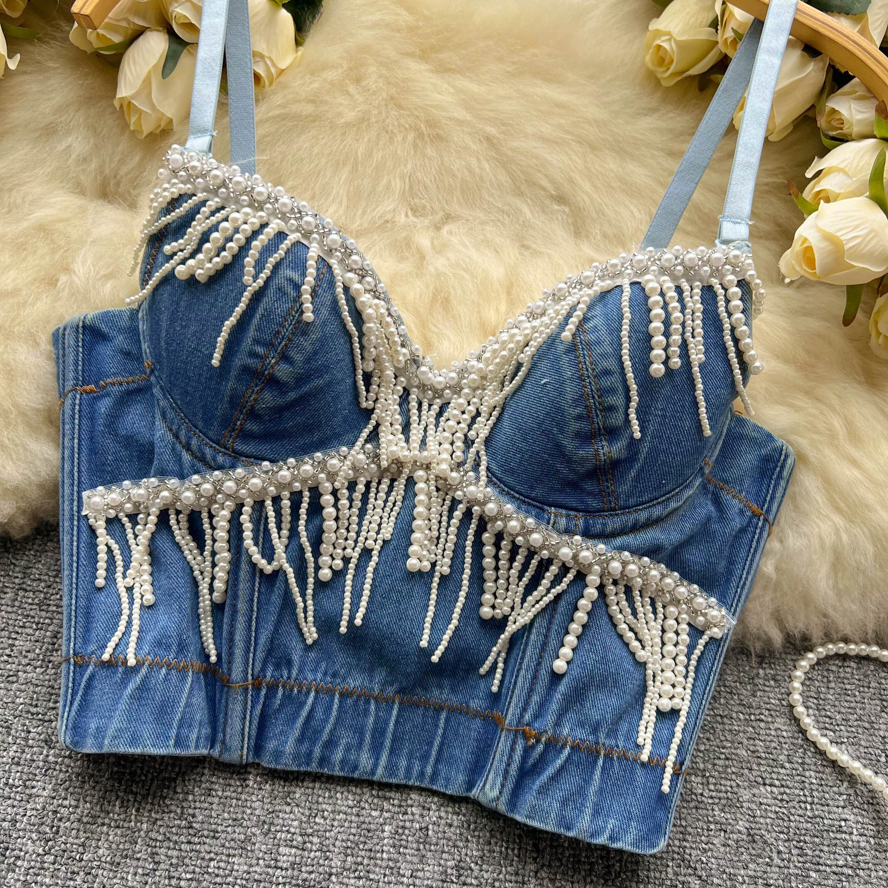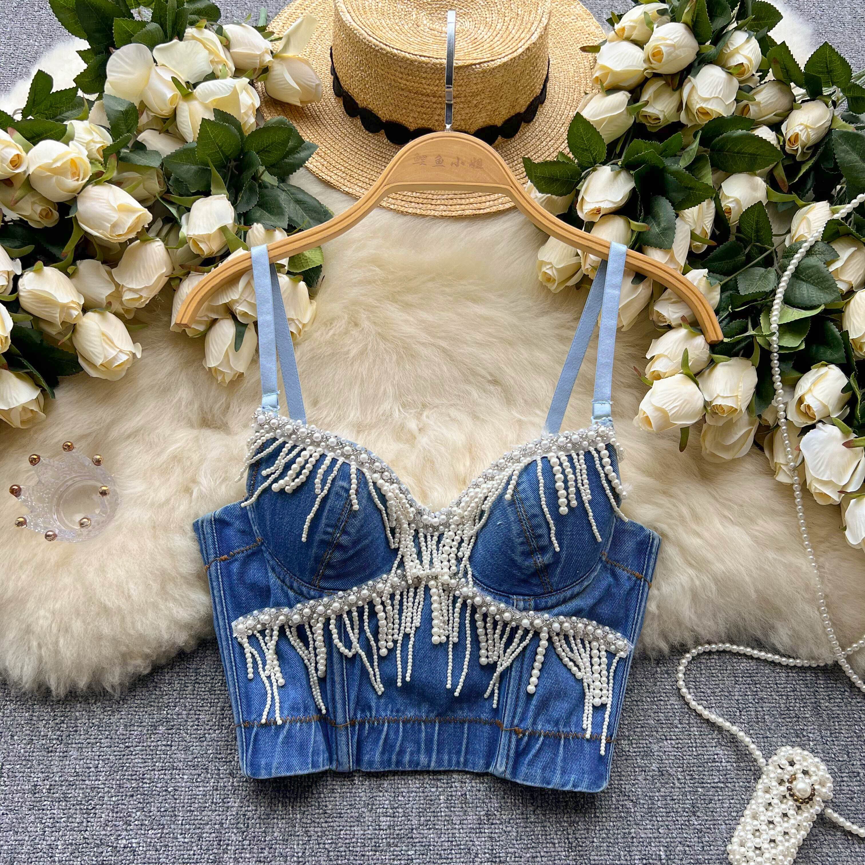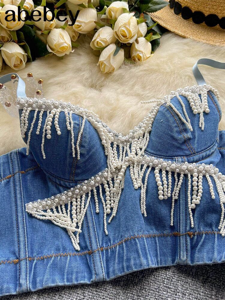 重工業釘打ちビーズ ダイヤモンド スタッズ セクシー クロップ トップ デニム スリング トップ Vset топ женский