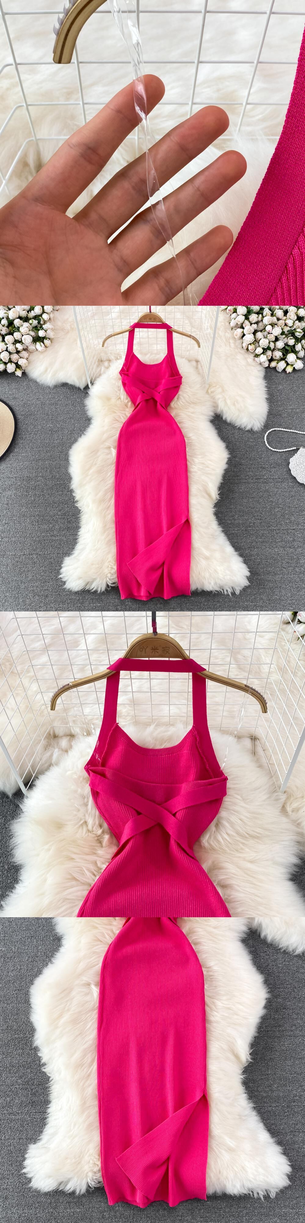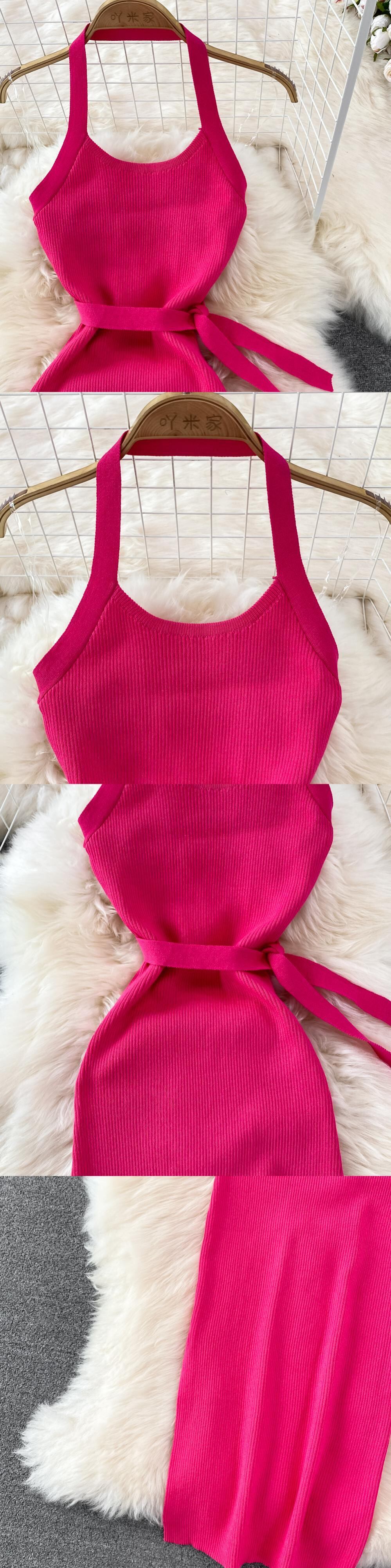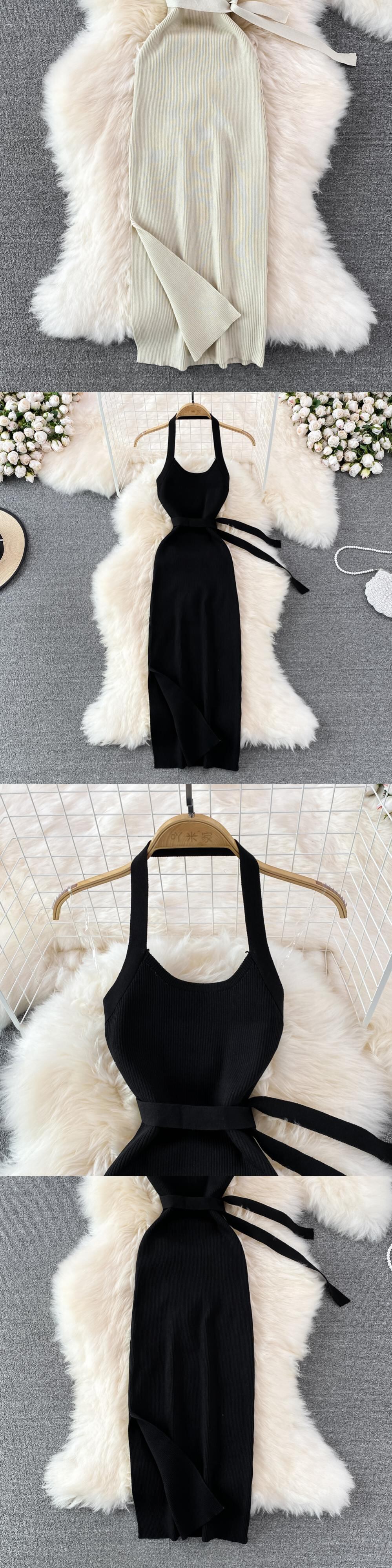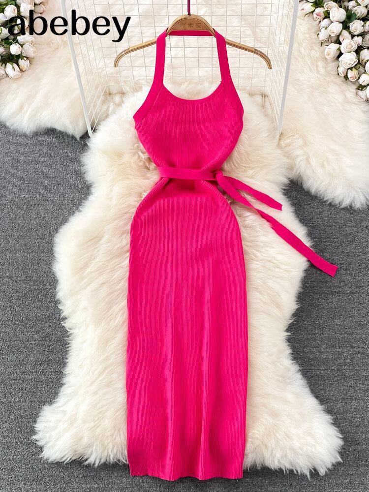 セクシー o ネックスパゲッティストラップニットドレス夏ノースリーブサッシレースアップスリムスプリットミディパーティードレス服 サマー 夏物 Oネック