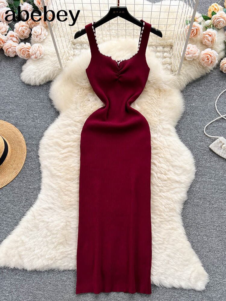 ビーズ夏ニットセクシーストラップドレスタンク Elatic ウエストボディコンサンドレスビーチ背中開いたロングドレス サマー 夏物