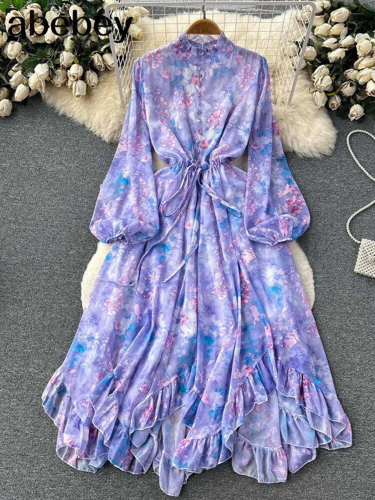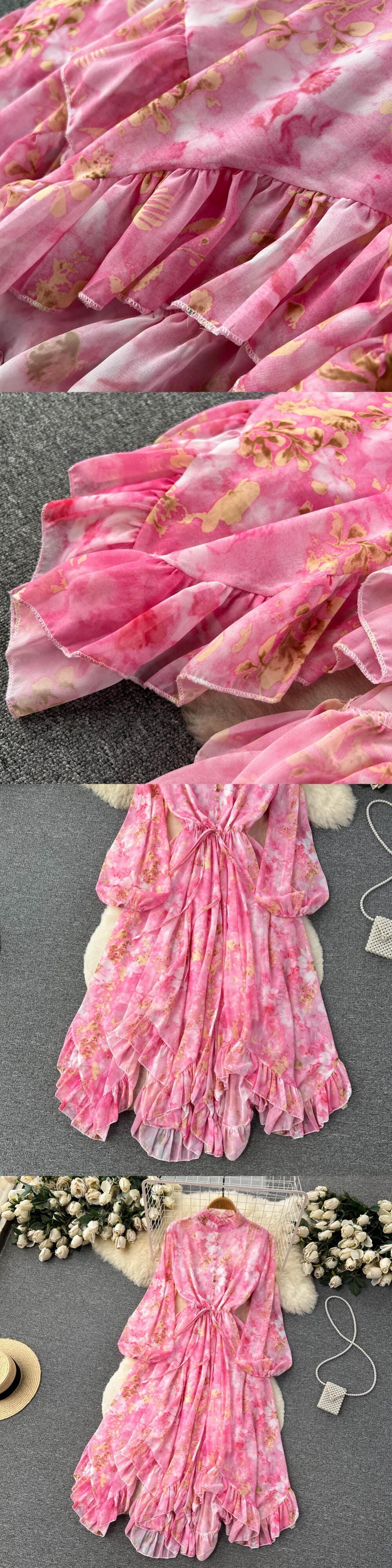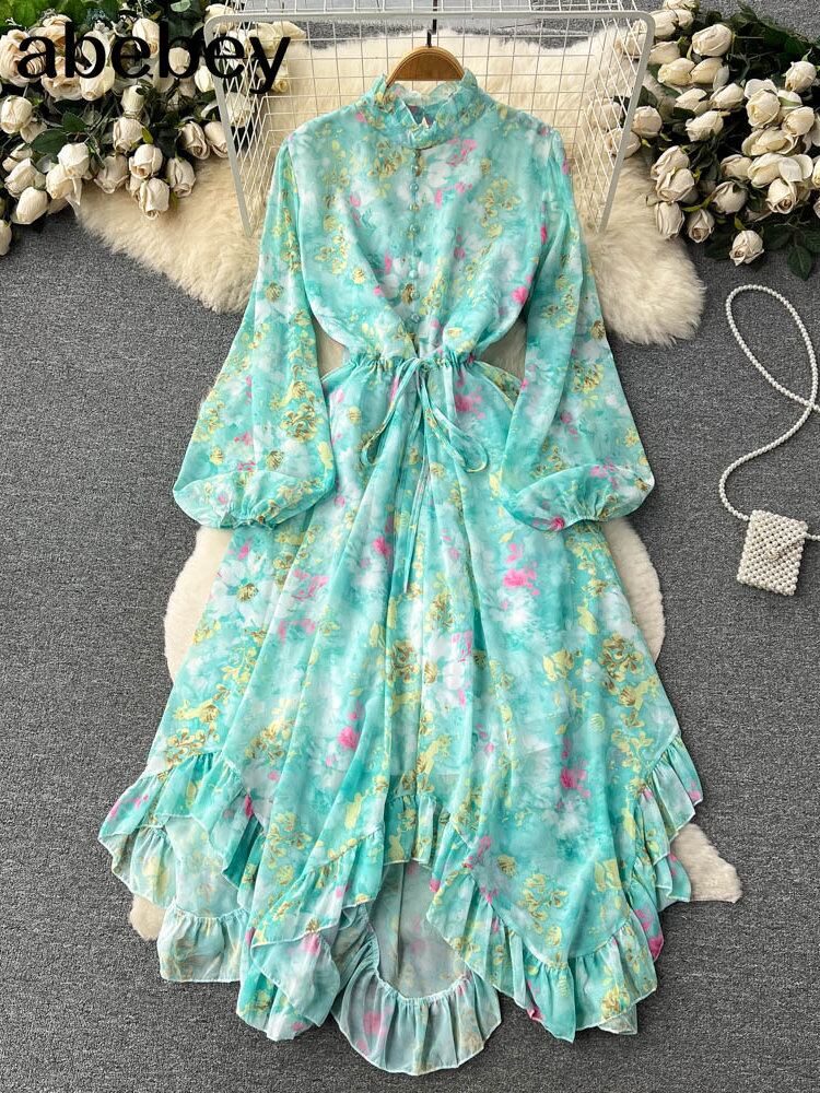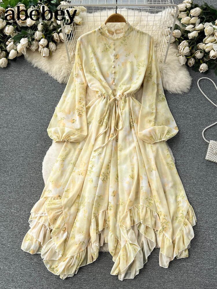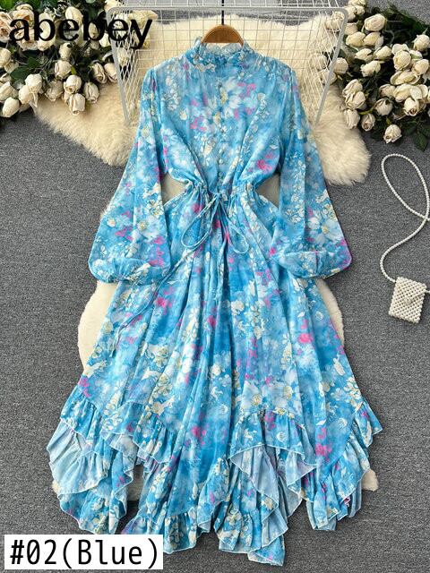 フランスレトロルーズドレスフローラルロングランタンスリーブビーズ不規則フリル弾性レースアップドレス ラッフル エラスティック 伸縮 花柄