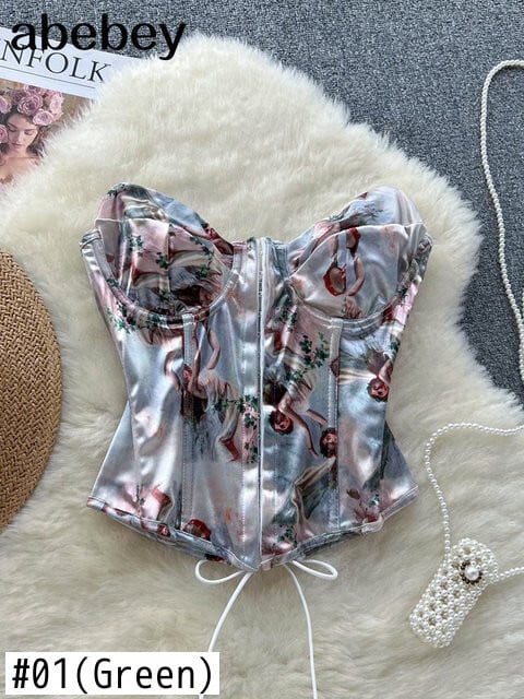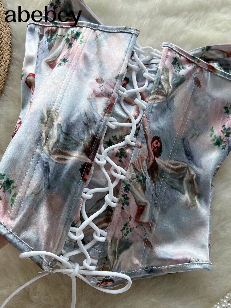 プリントバックレスストラップレスタンクトップサテンレースアップクロスフレンチサテンコート夏フレンチセクシークラブクロップトップ サマー 夏物